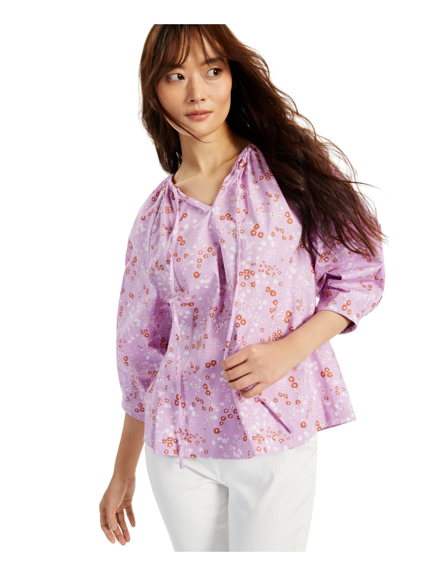 60452632 LAUREN RALPH LAUREN $135 MSRP Womens Purple Ruffled Lined Button Up Shirttail Hem Floral Tie Neck Wear To Work Blouse M