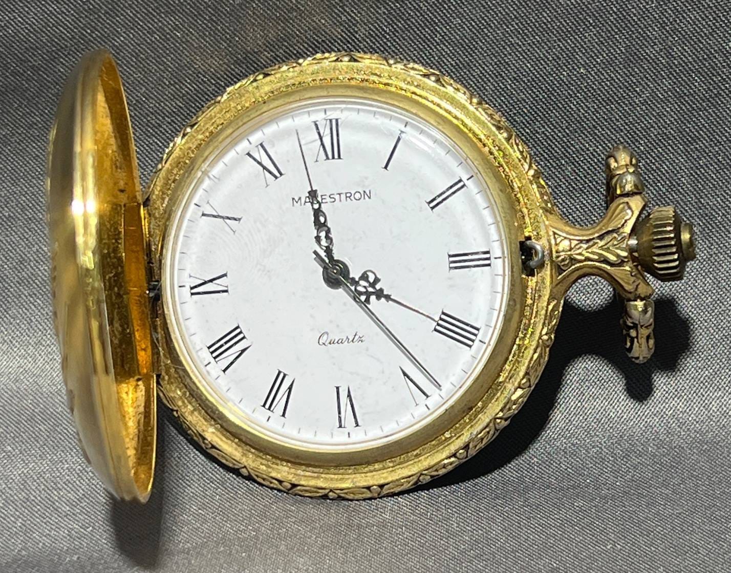 2018 Gold-Tone Maestron Quartz Pocket Watch with Relief Detail, 2” x 3”, Back will not come off, Untested