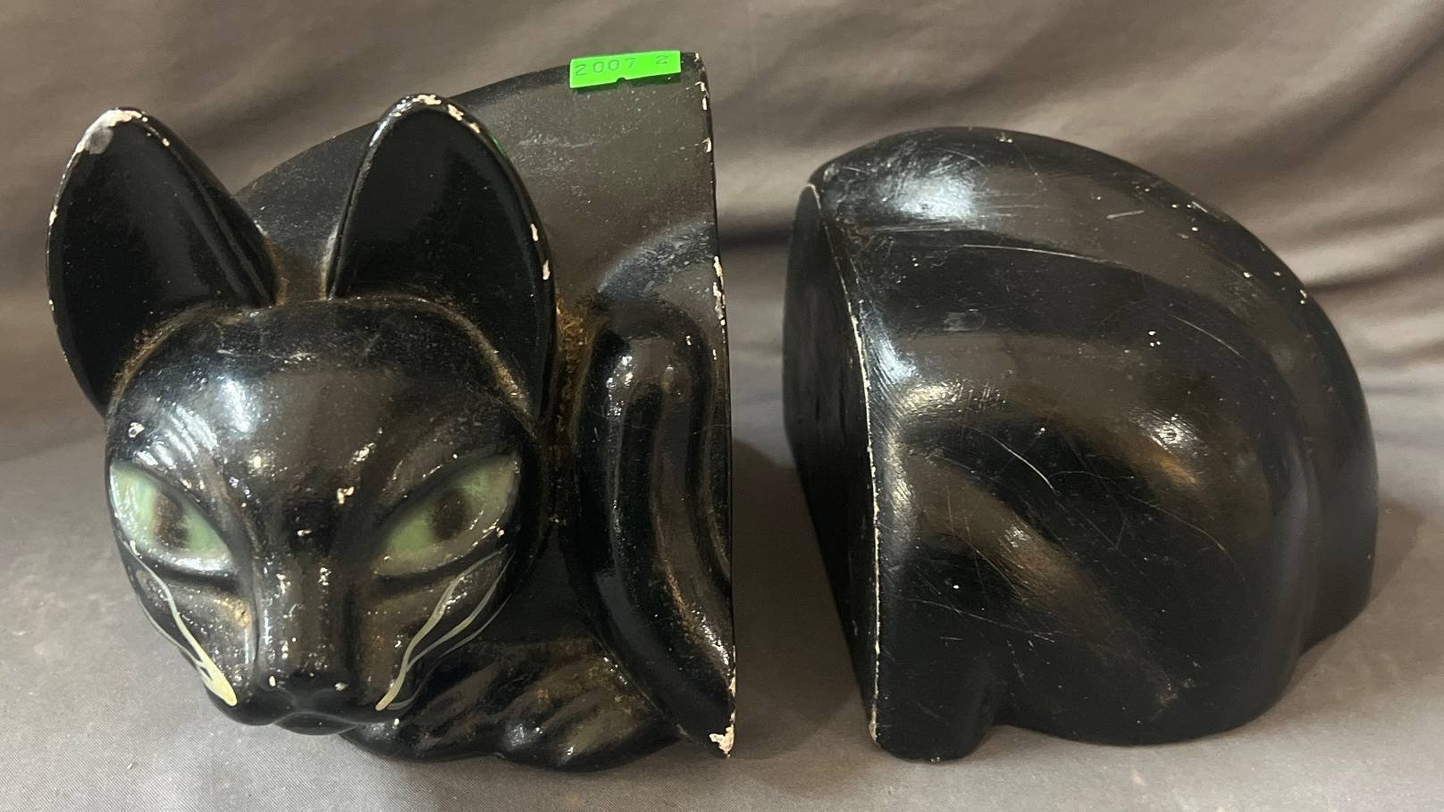2007 Black Cat-Shaped Bookends with Green Eyes, 4.5” x 3” & 4.5” x 5”, Paint worn