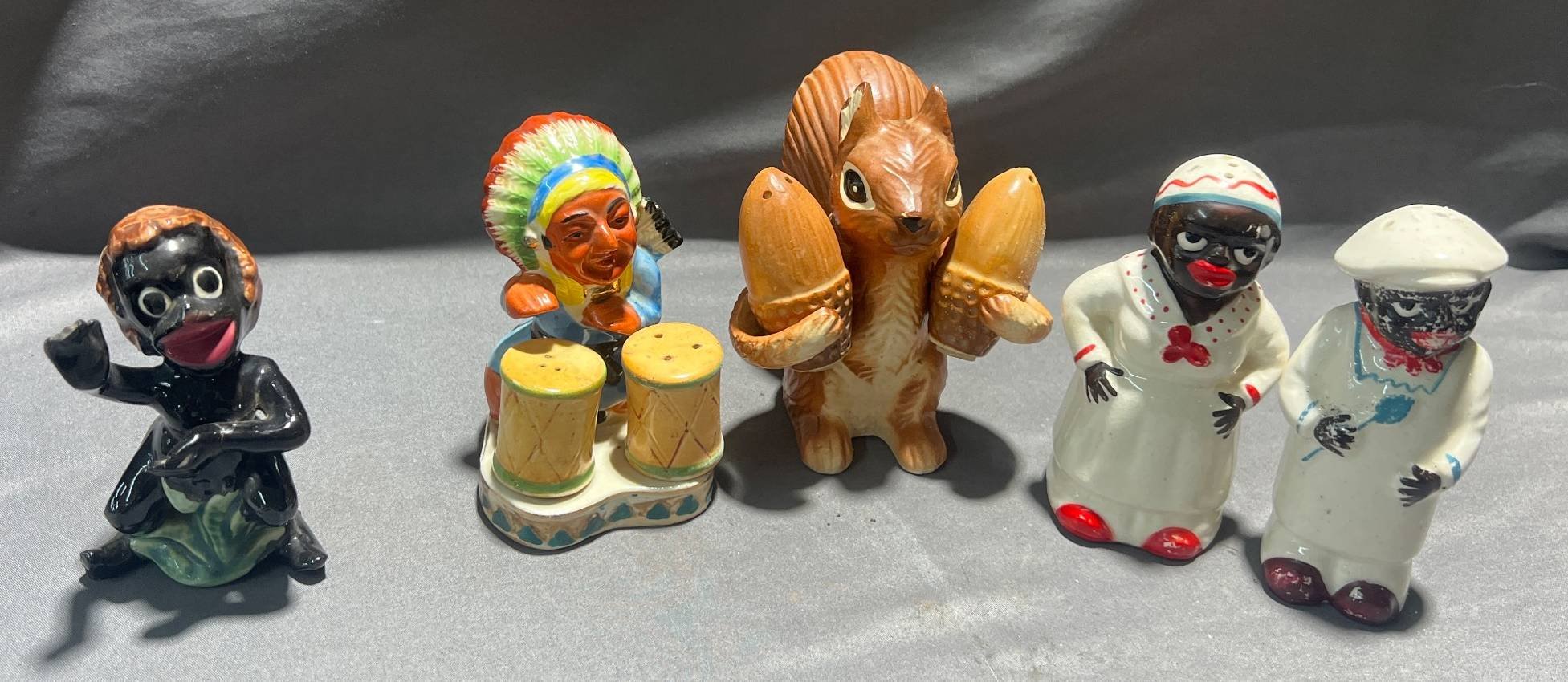 2016 5 Salt and Pepper Shakers inc. Black Americana Aunt Jemima & Uncle Moses, Native American Chief and Squirrel – Artmark & Japan Marks, 2.5” x 3” – 2” x 4”