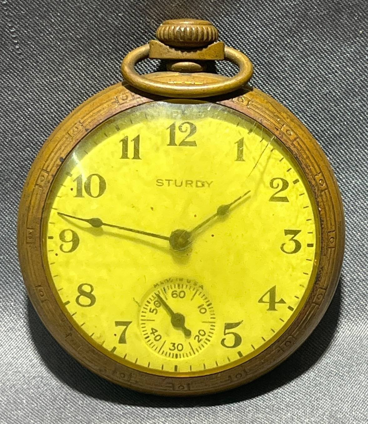 2022 Sturdy Brass Colored Pocket Watch with Yellow Dial and Engraved Back, 2” x 2.5” Untested