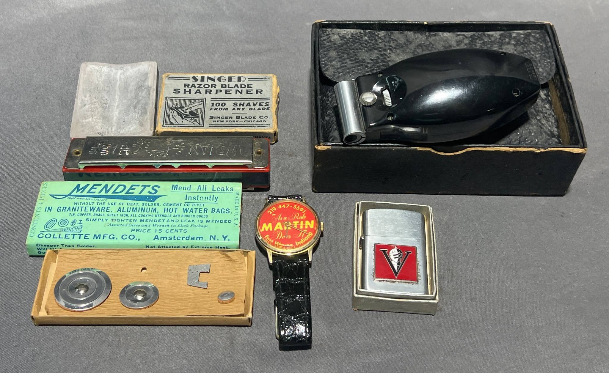 2023 Singer Razor Sharpener, Magnus Indian Chief Harmonica, Martin Advertising Watch, and Packard Lektro Shaver, 1.5” x 2.5” – 4” x 5.5” Untested