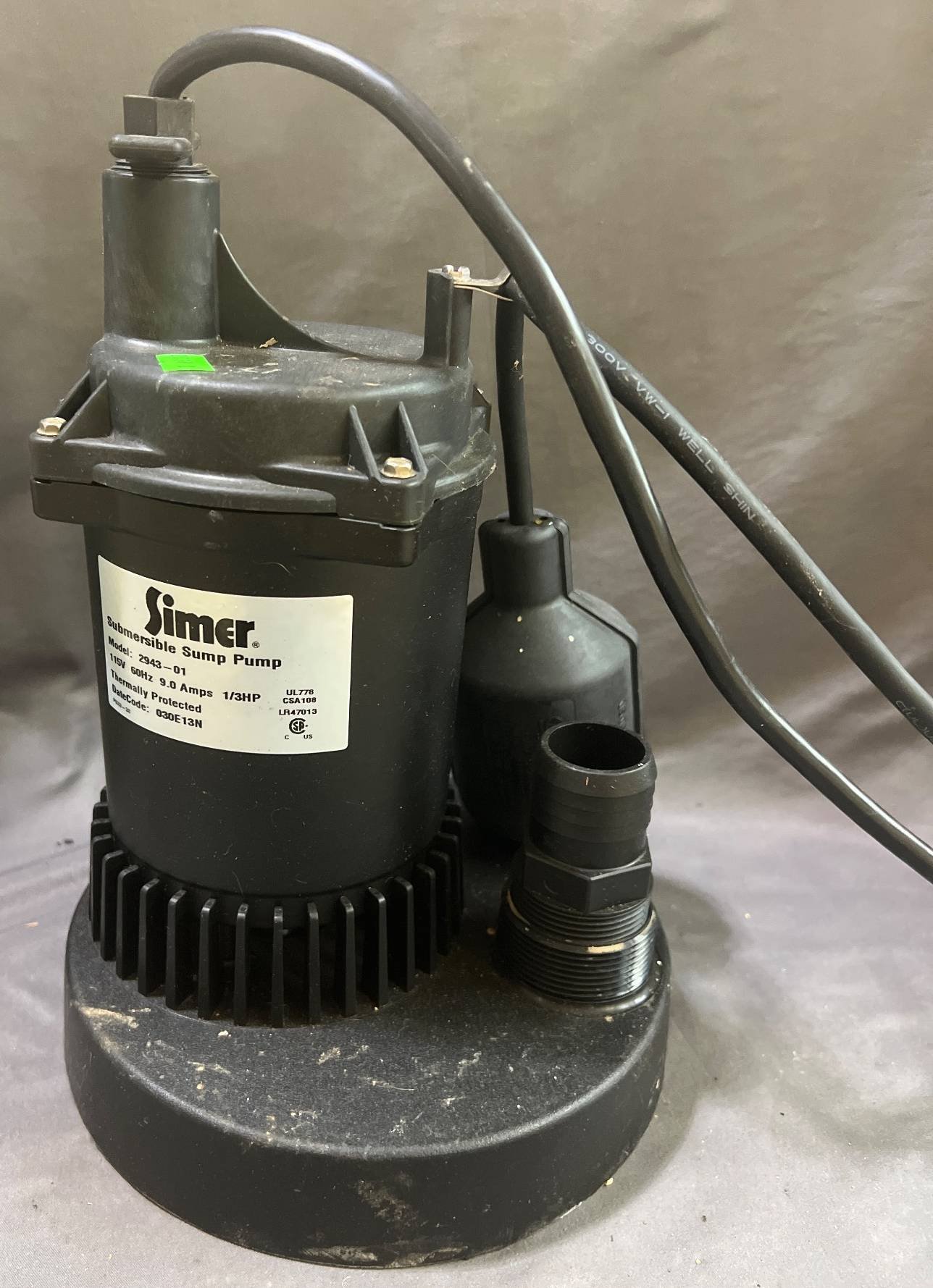 2034 Simer Submersible Sump Pump, 115V, 0.33 HP, Model 2943-01, 8” x 10.5” (Not Tested)