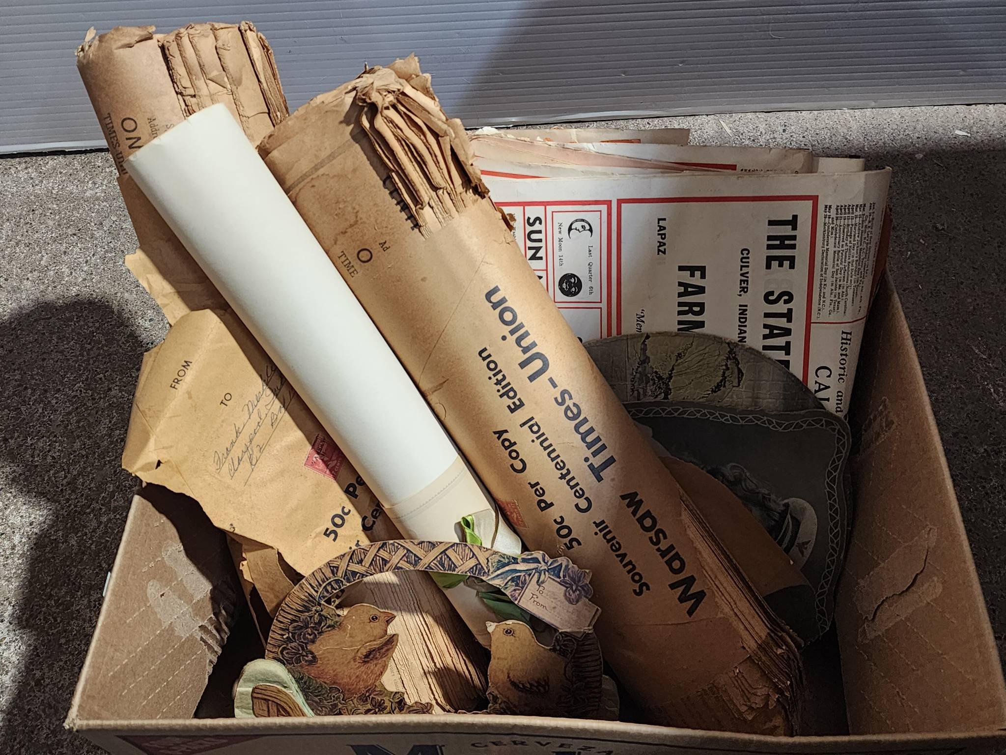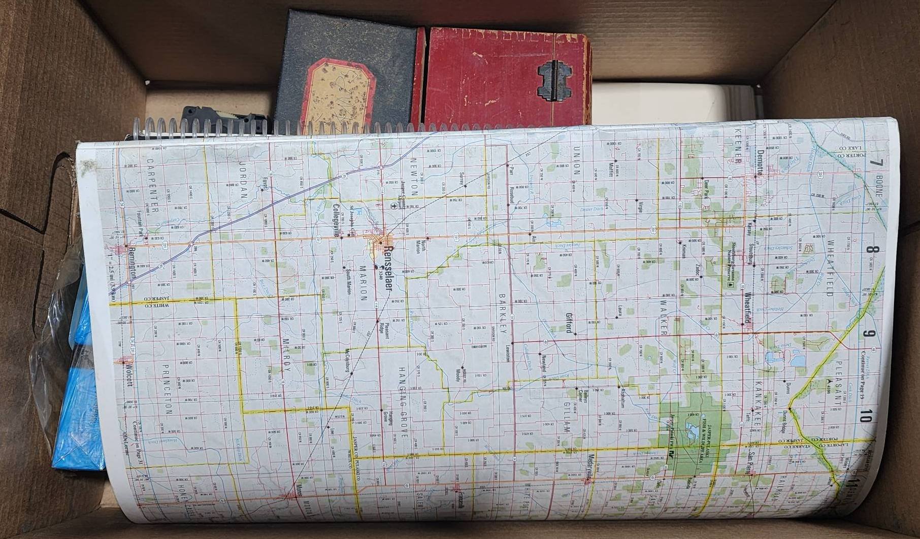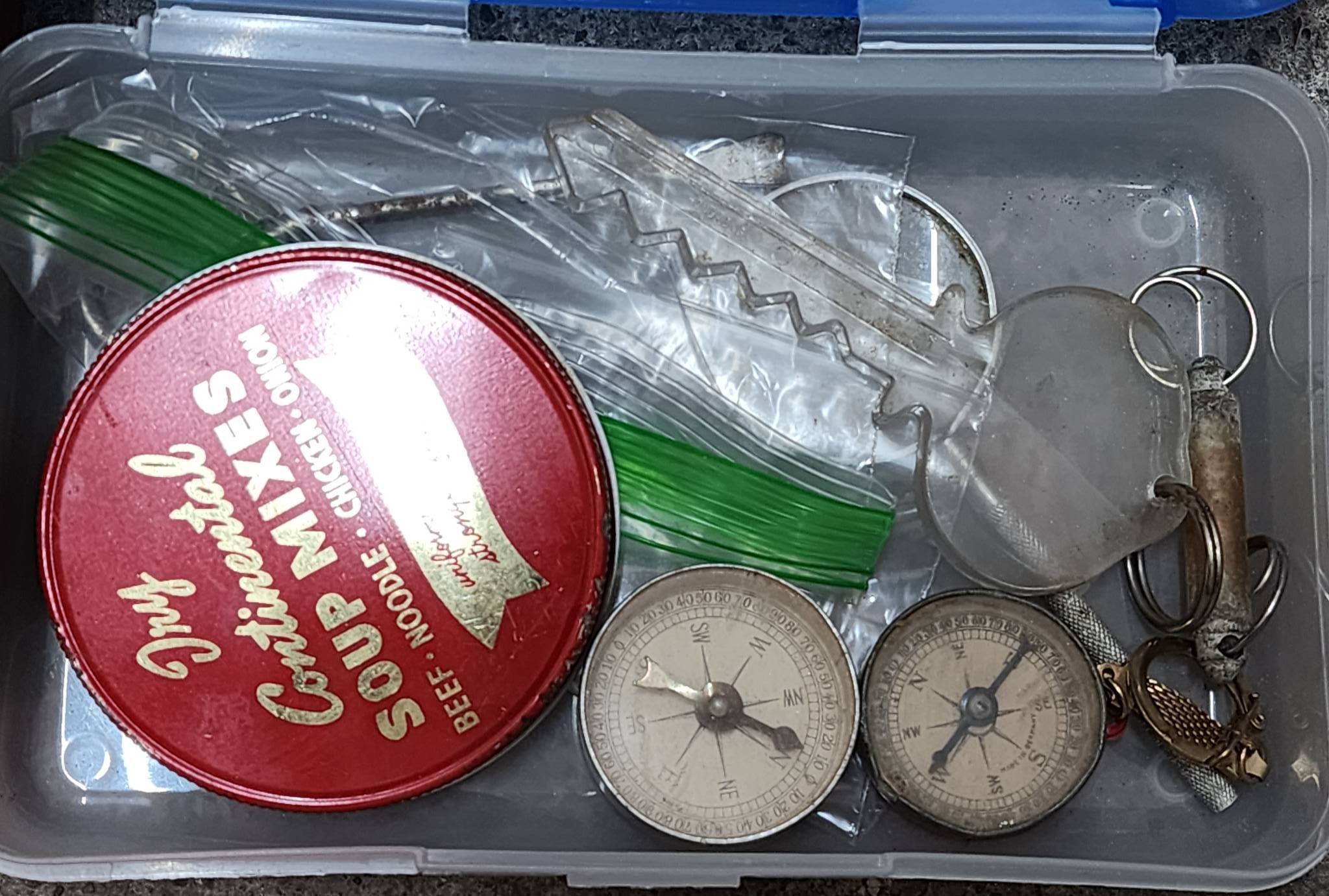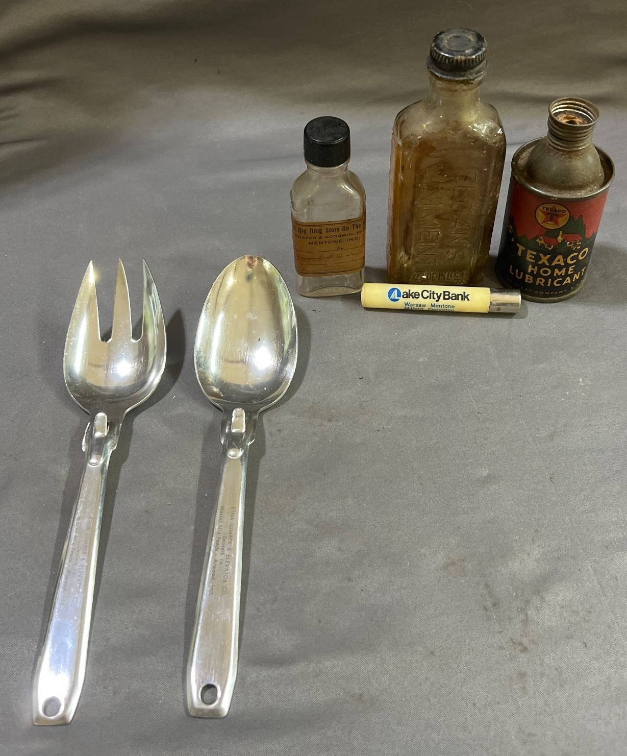 2036 Advertising inc. Mentone Drug Bottle, Etna Lumber & Elevator Utensils, Lake City Bank, Texaco Can - 5” x 3” – 1.5” x 7.5”