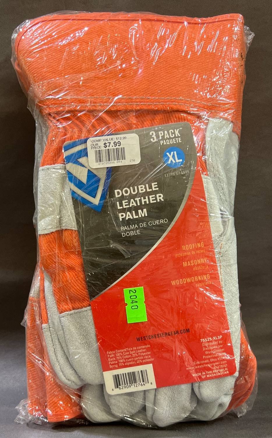 2040 3-Pack of Double Leather Palm Gloves, XL 6.5” x 11.5”