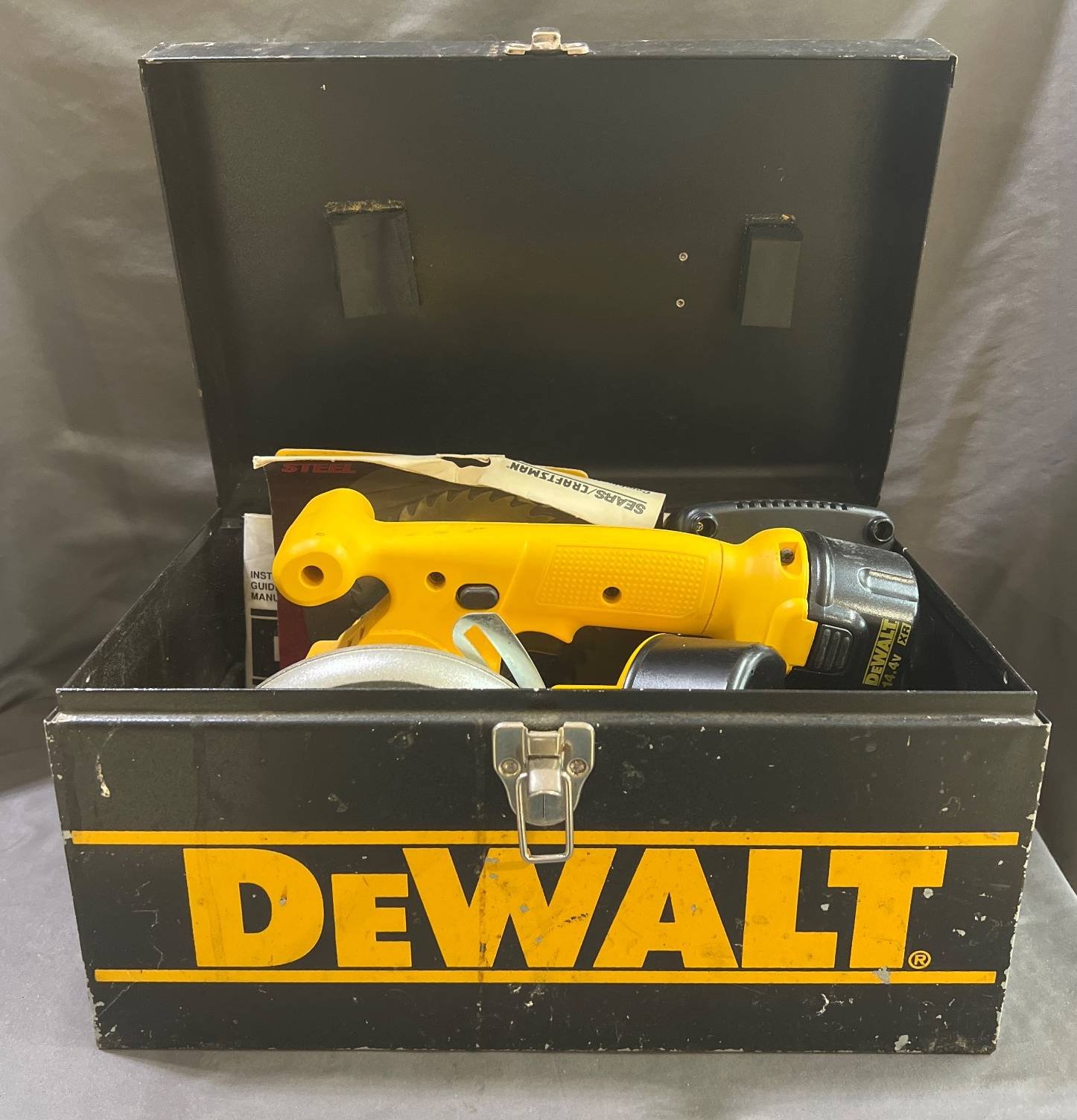2043 DeWalt DW935 Cordless Trim Saw with Battery, Charger & Case, 3” x 4.5-14.5” x 9” x 8” Untested