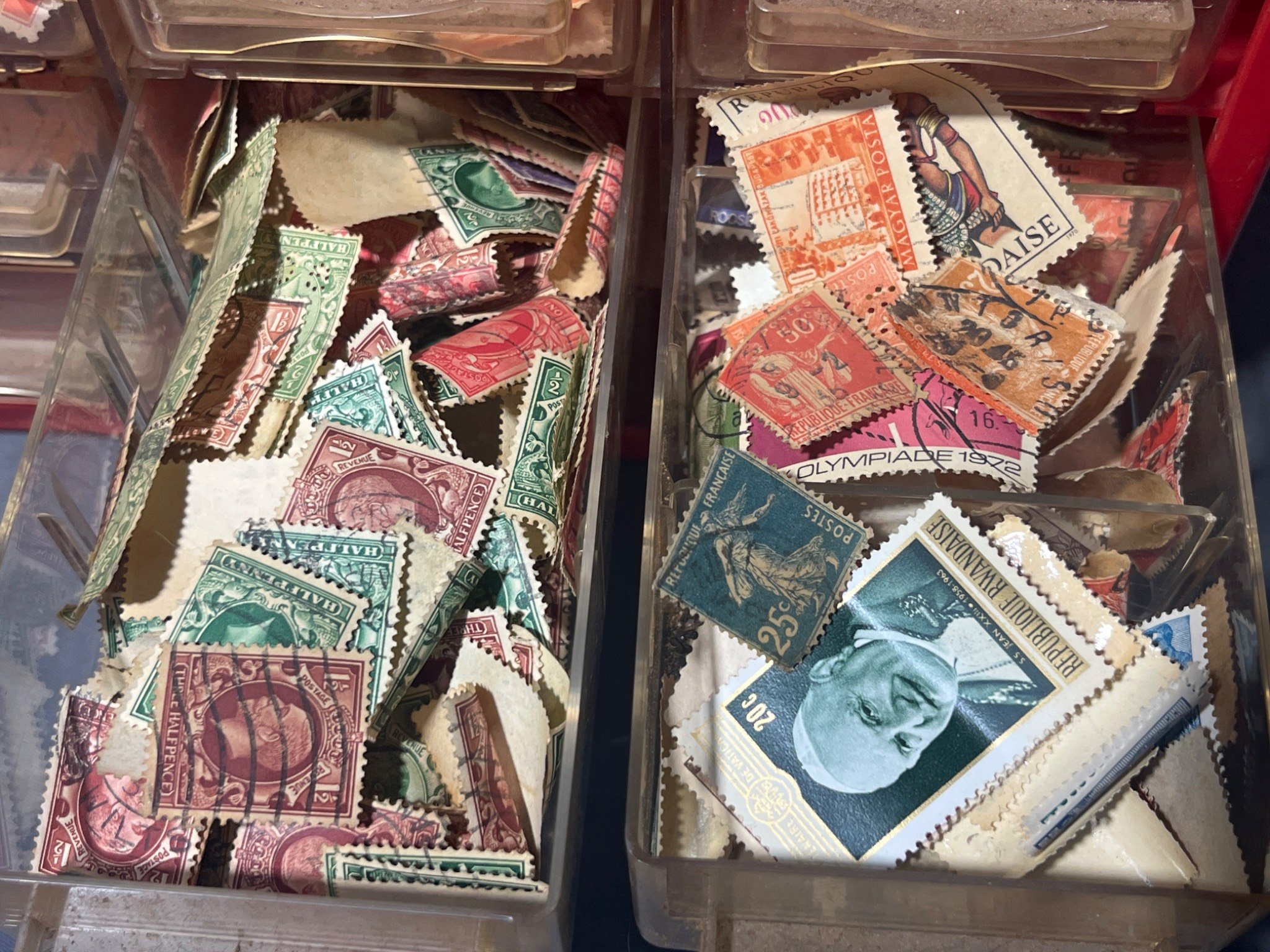 2056 2 Red Plastic and Metal Storage Organizers, With Plastic Drawers Containing Postage Stamps, 12x6x6?, 9×5.5×5.5?