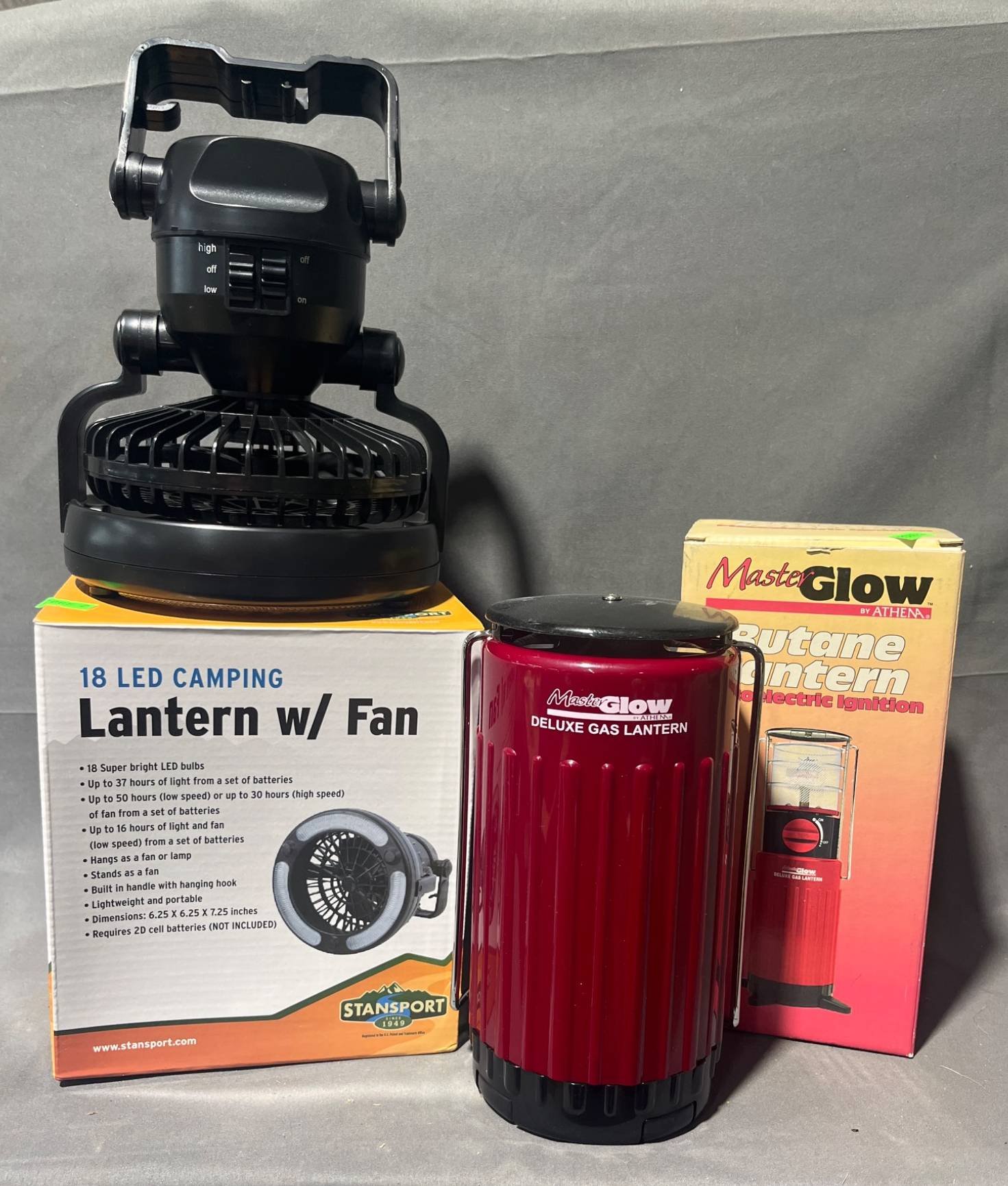 2065 Stansport 18 LED Camping Lantern w/ Fan and MasterGlow Butane Lantern 6.5”,8”