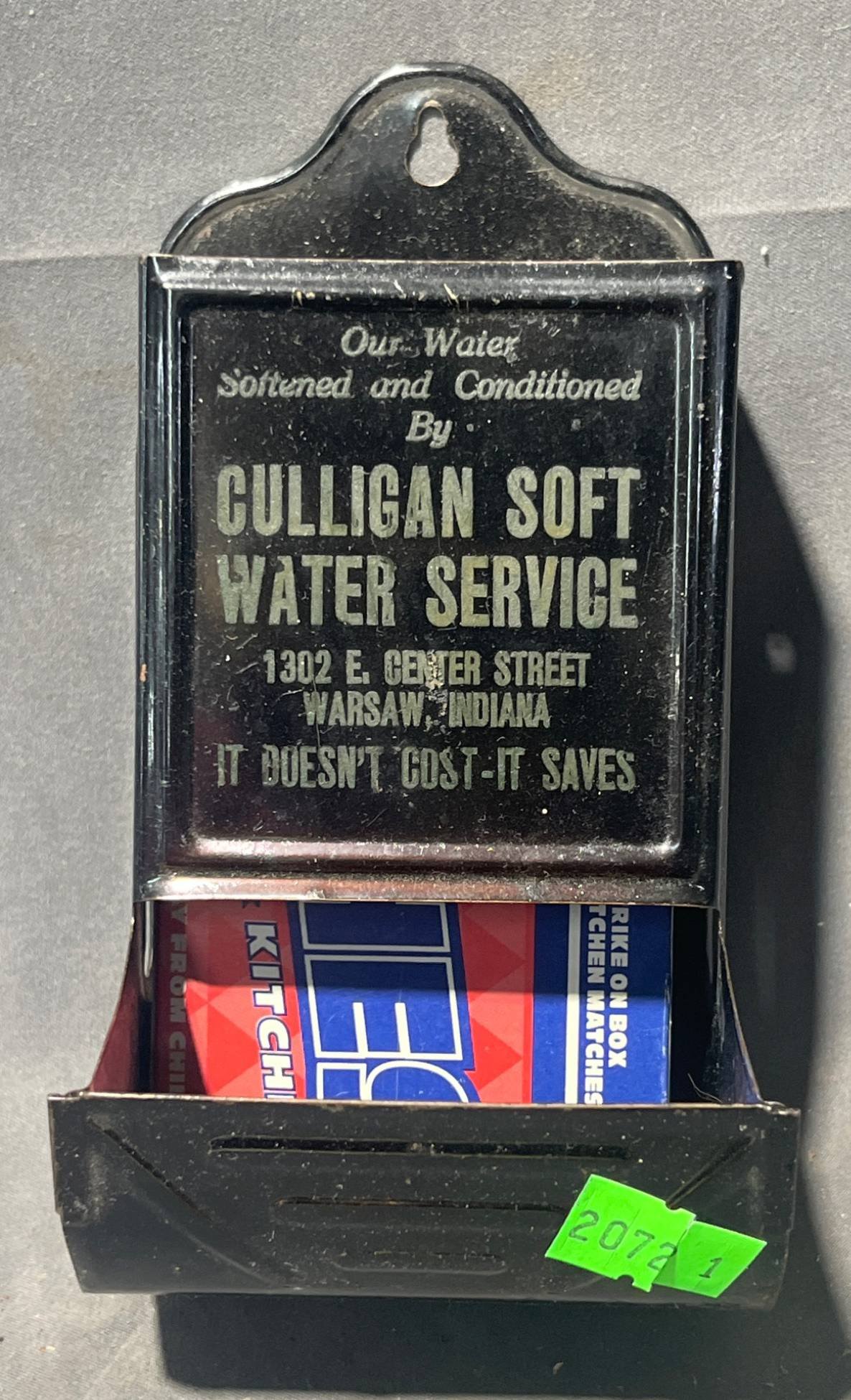 2072 Metal Matchbox Holder with Culligan Soft Water Service Advertising, Warsaw, Indiana 3.25 W