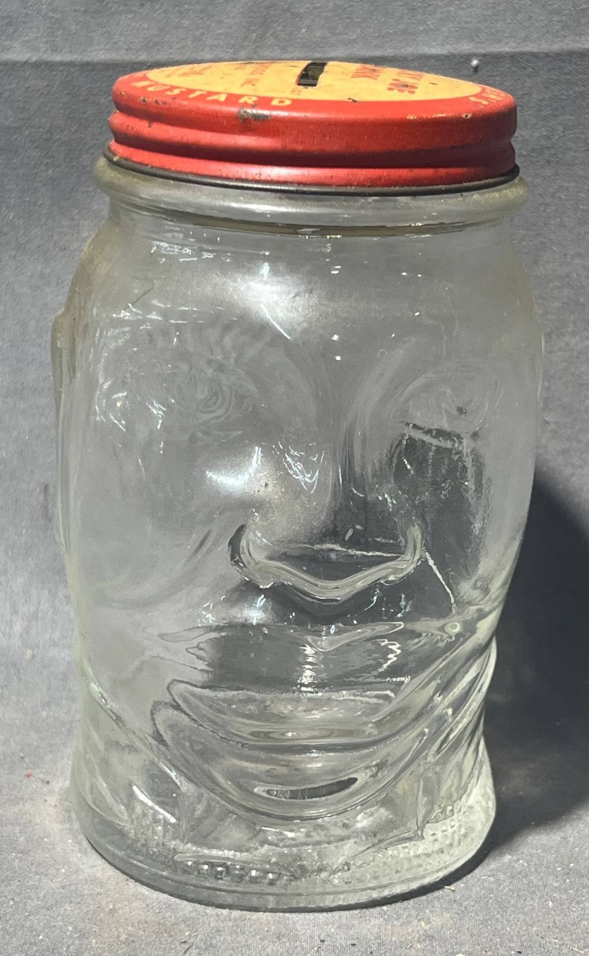 2075 Nash’s Lucky Joe Bank Glass Jar with Red Coin Slot Lid 2.5? W