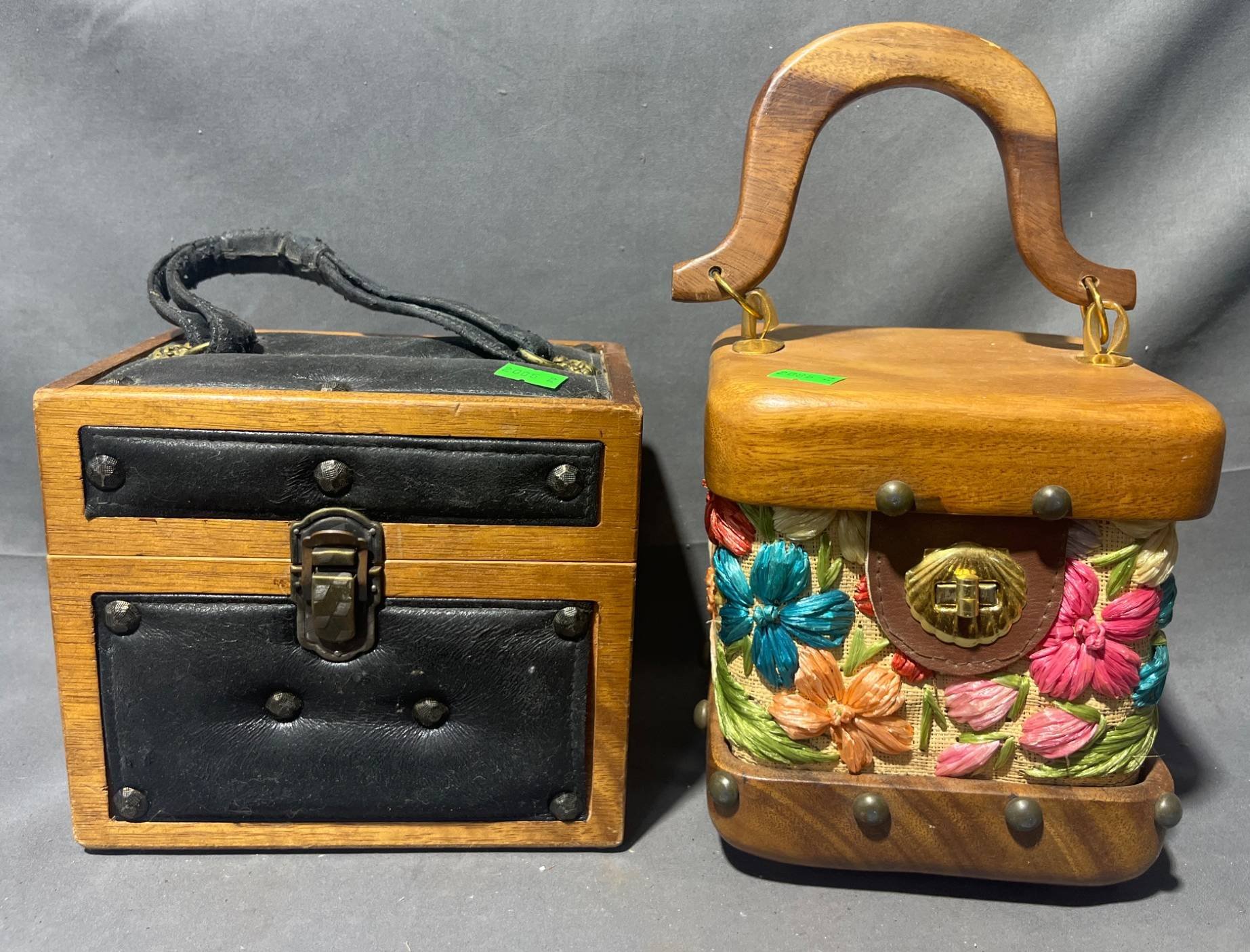 2085 2 Wood, Handled Sewing Boxes: Embroidered Floral Box and Leather Accent Box