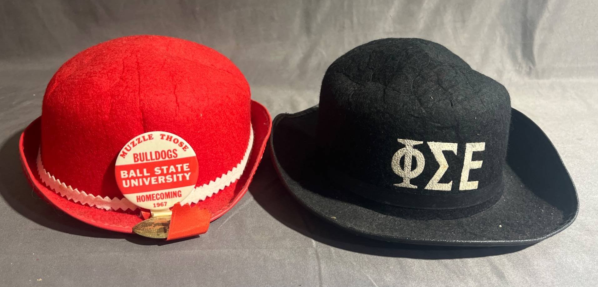 2088 2 Red and Black Felt Hats – Ball State University Homecoming 1967 – Muncie, IND & Phi Sigma Epsilon 7.5”
