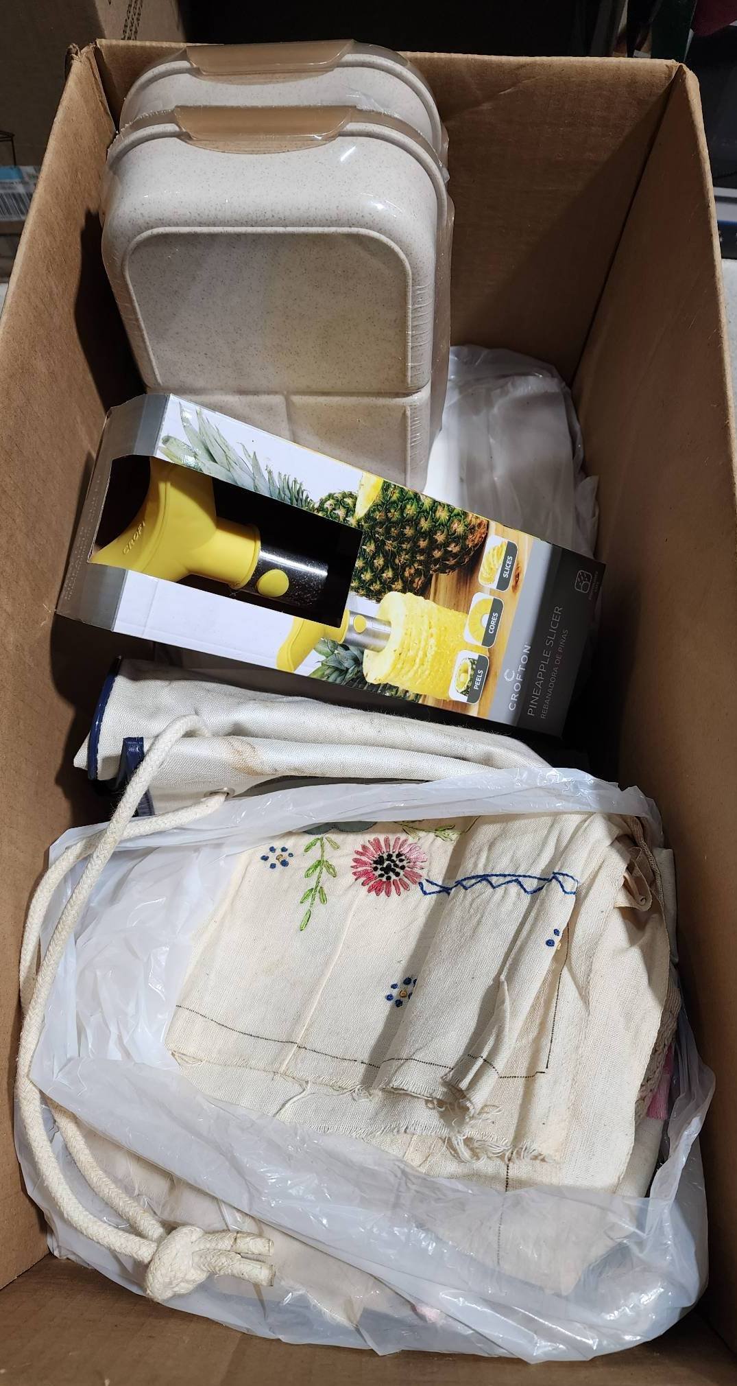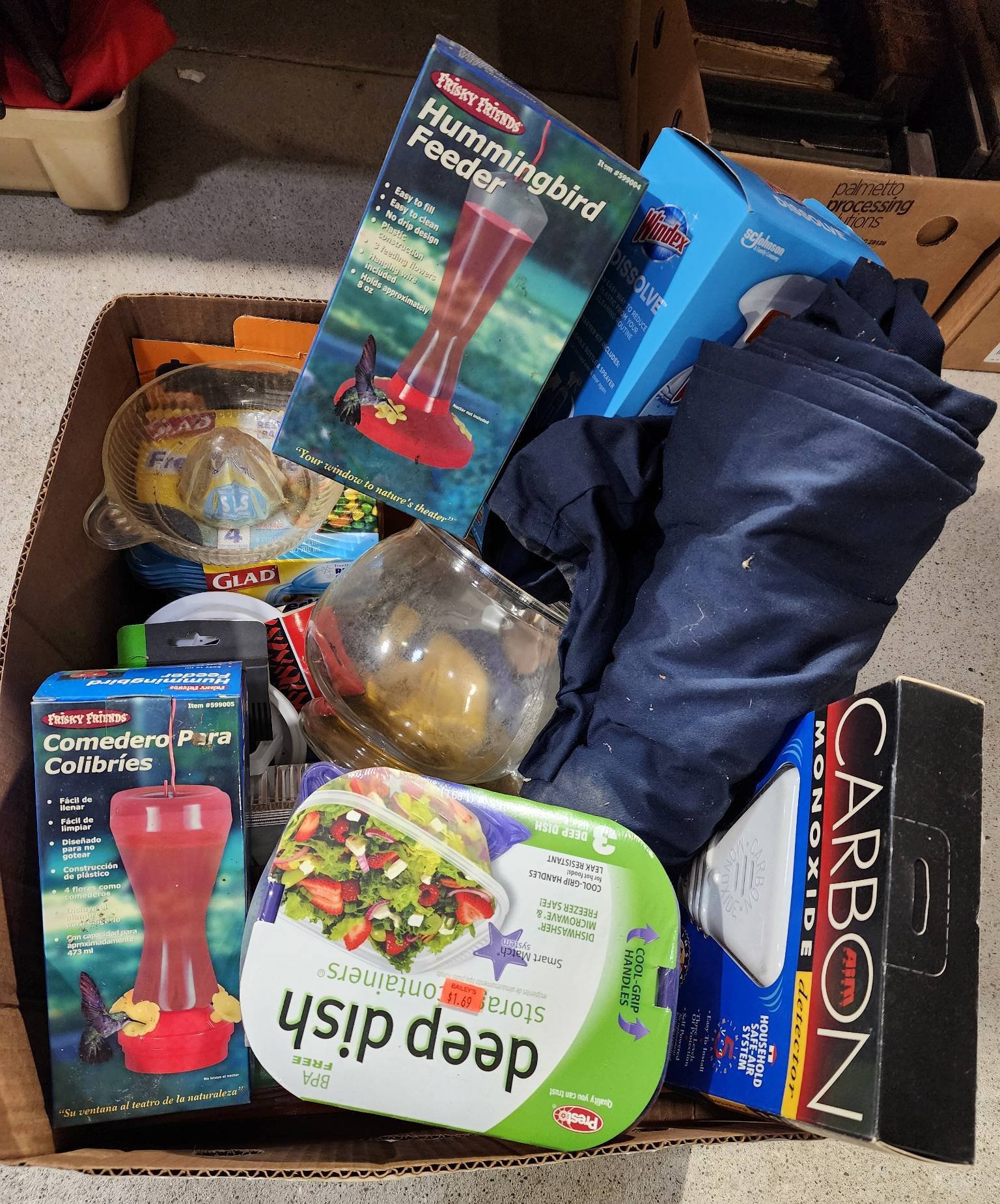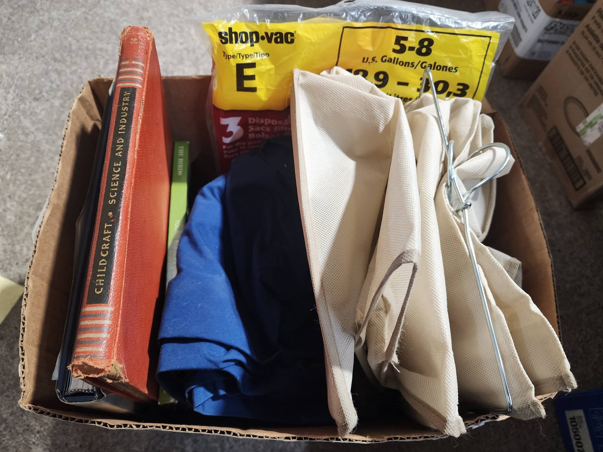 9242 Plastic Pet Carrier, Fasteners in Plastic Bin, and Fabric with Metal Hook in Wood Box