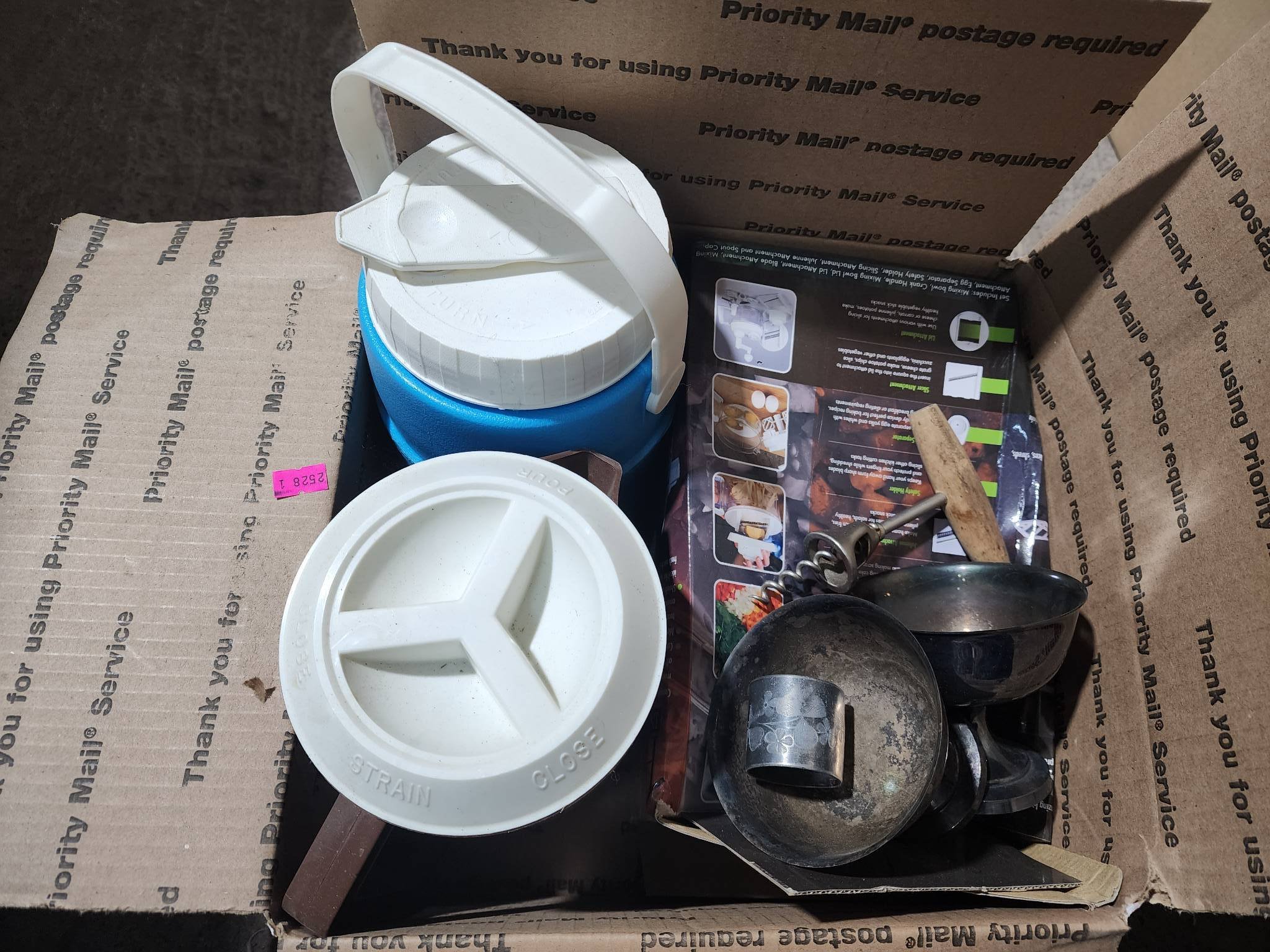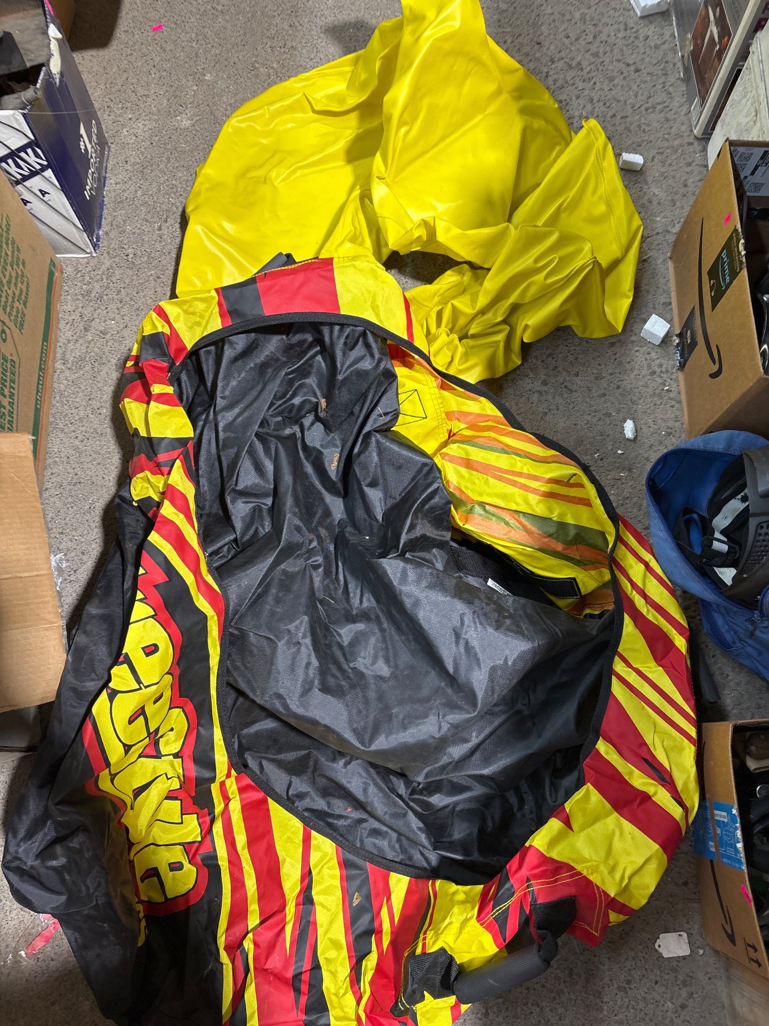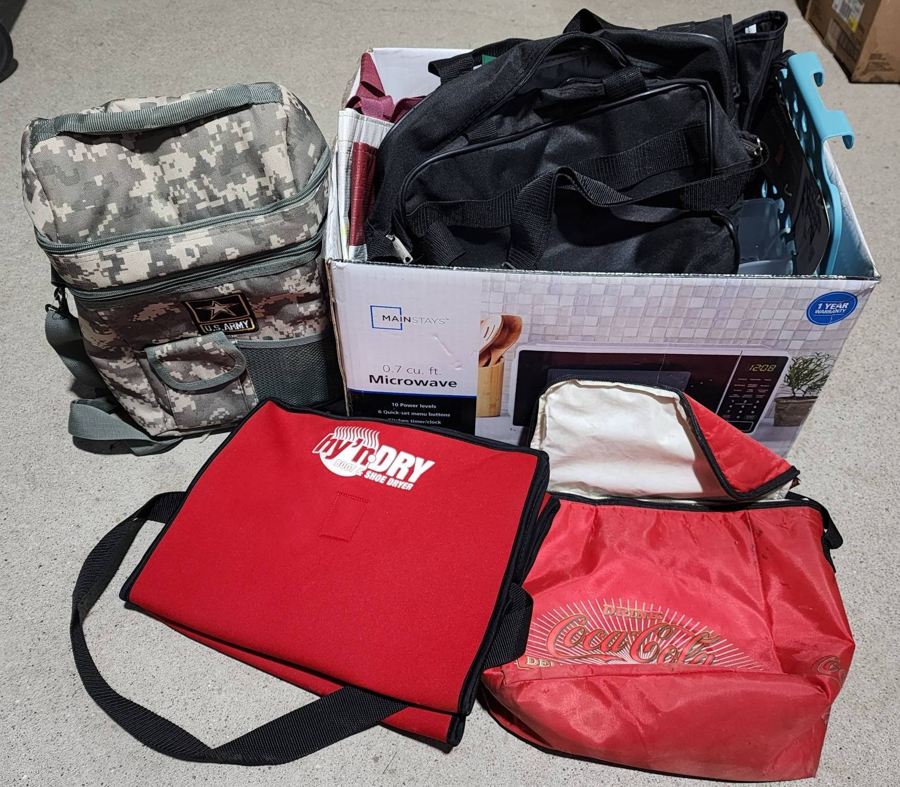 9403 Red Cooler, Bicycle Tire by Huffy, and Black Drawstring Bag with Cloth
