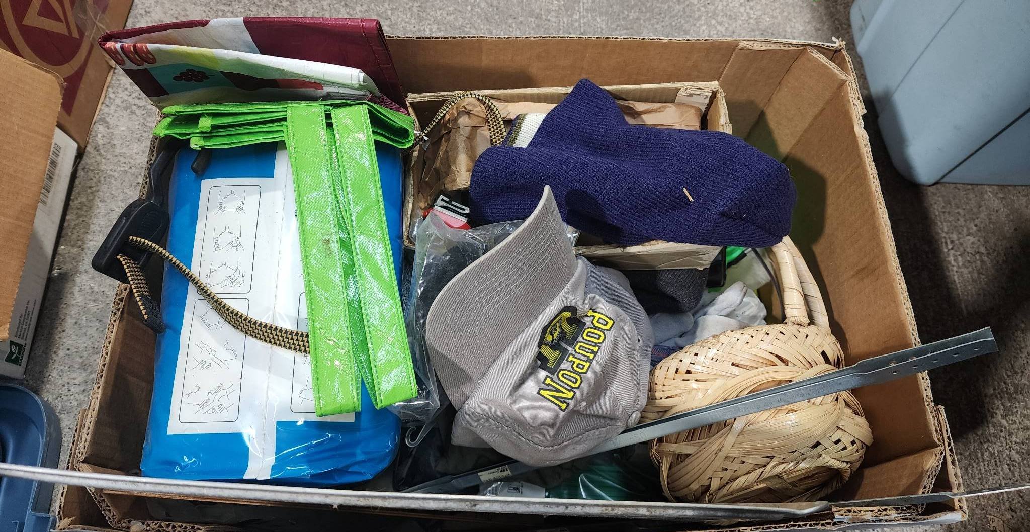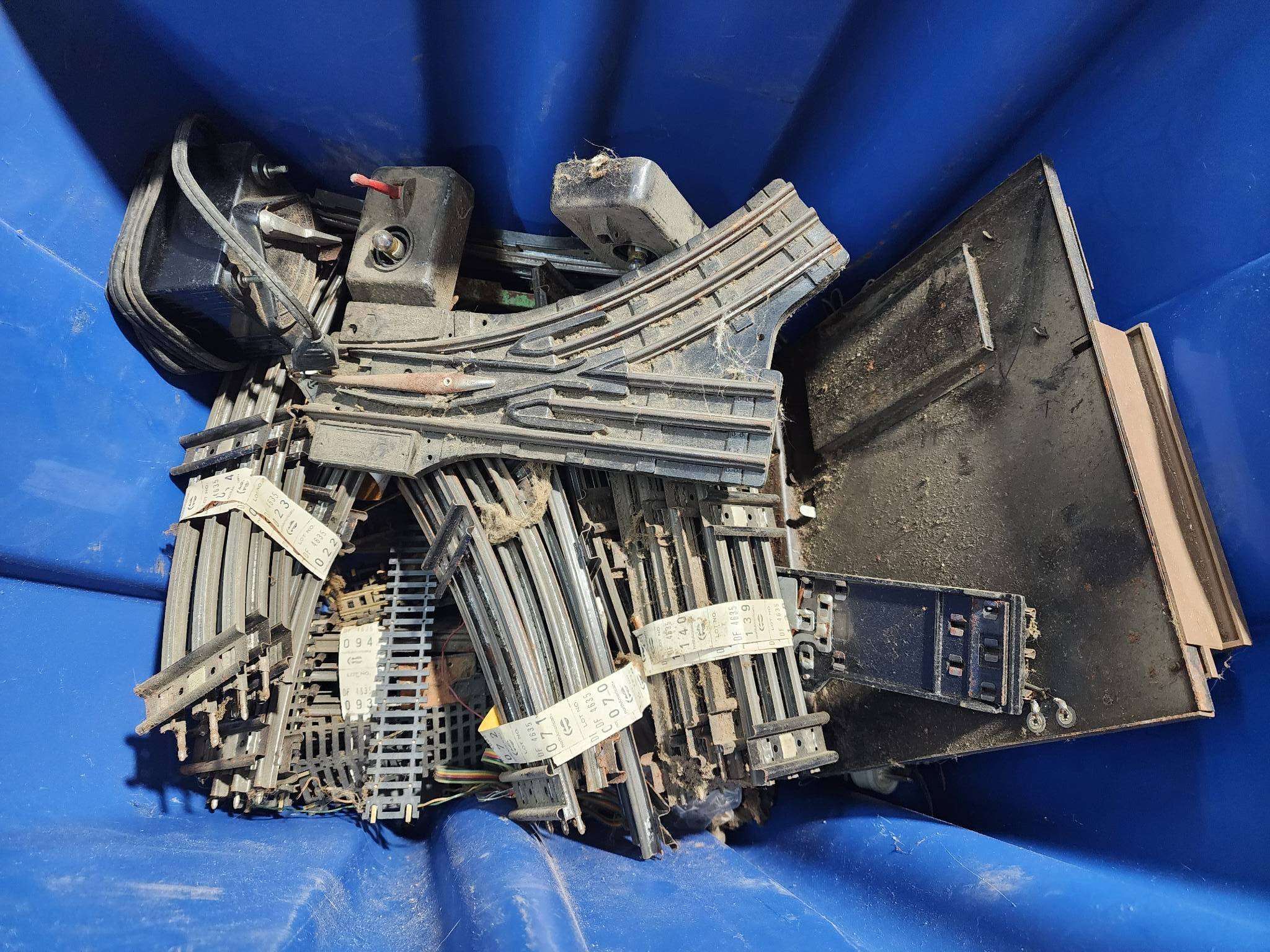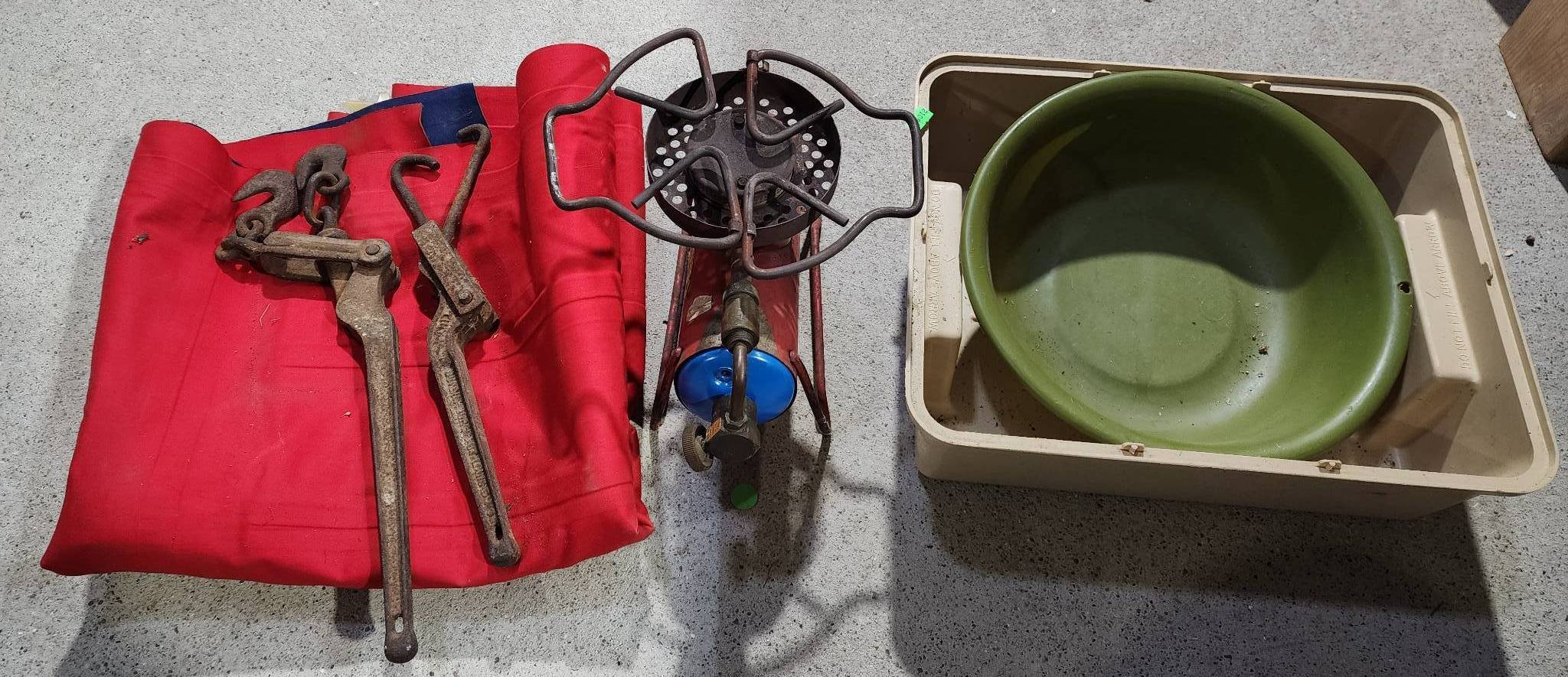 9243 Trash Cans, Tool Box with Contents, and Sears Roebuck Camp Stove