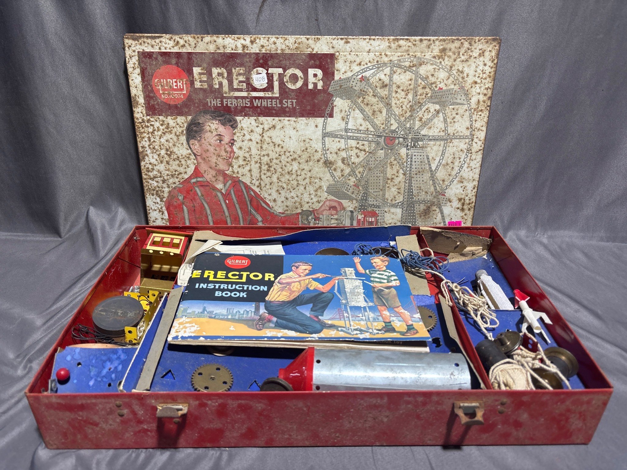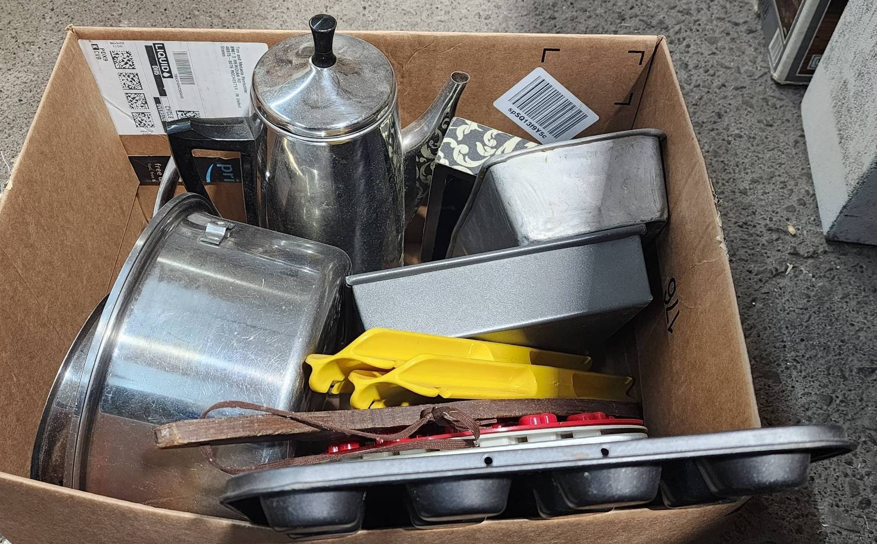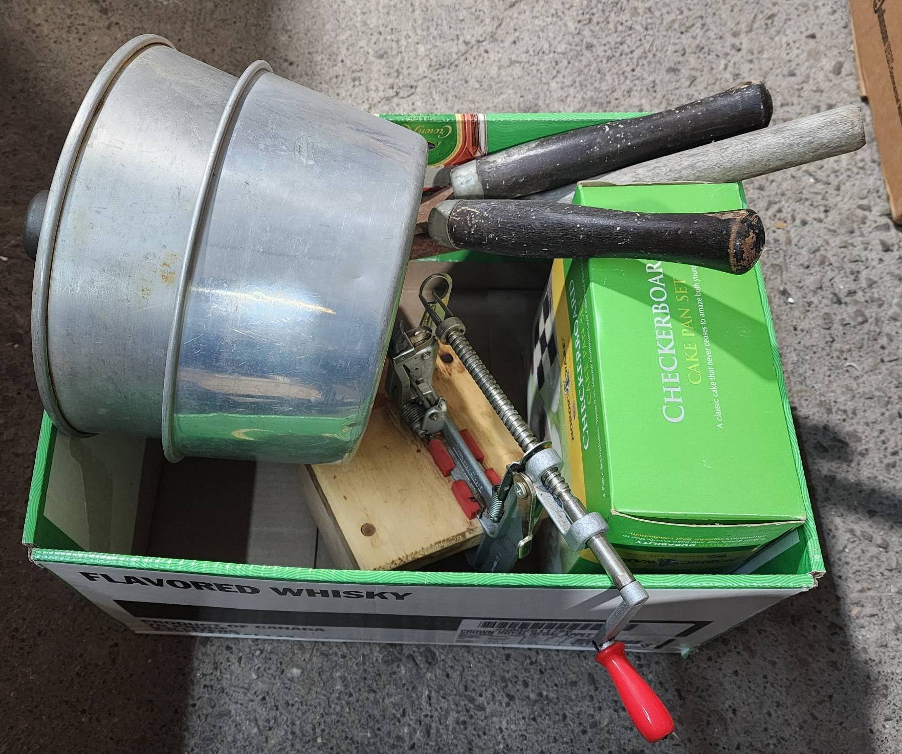 9243 Trash Cans, Tool Box with Contents, and Sears Roebuck Camp Stove