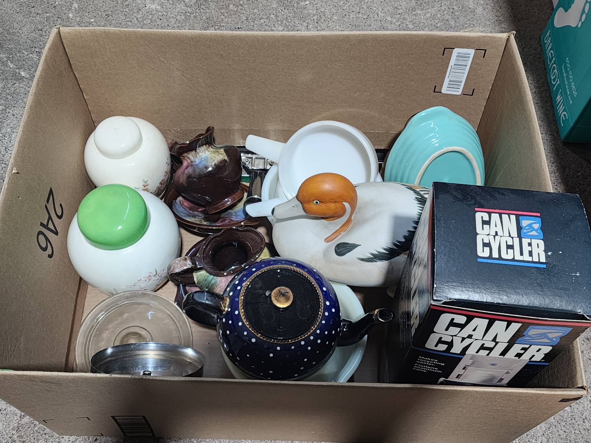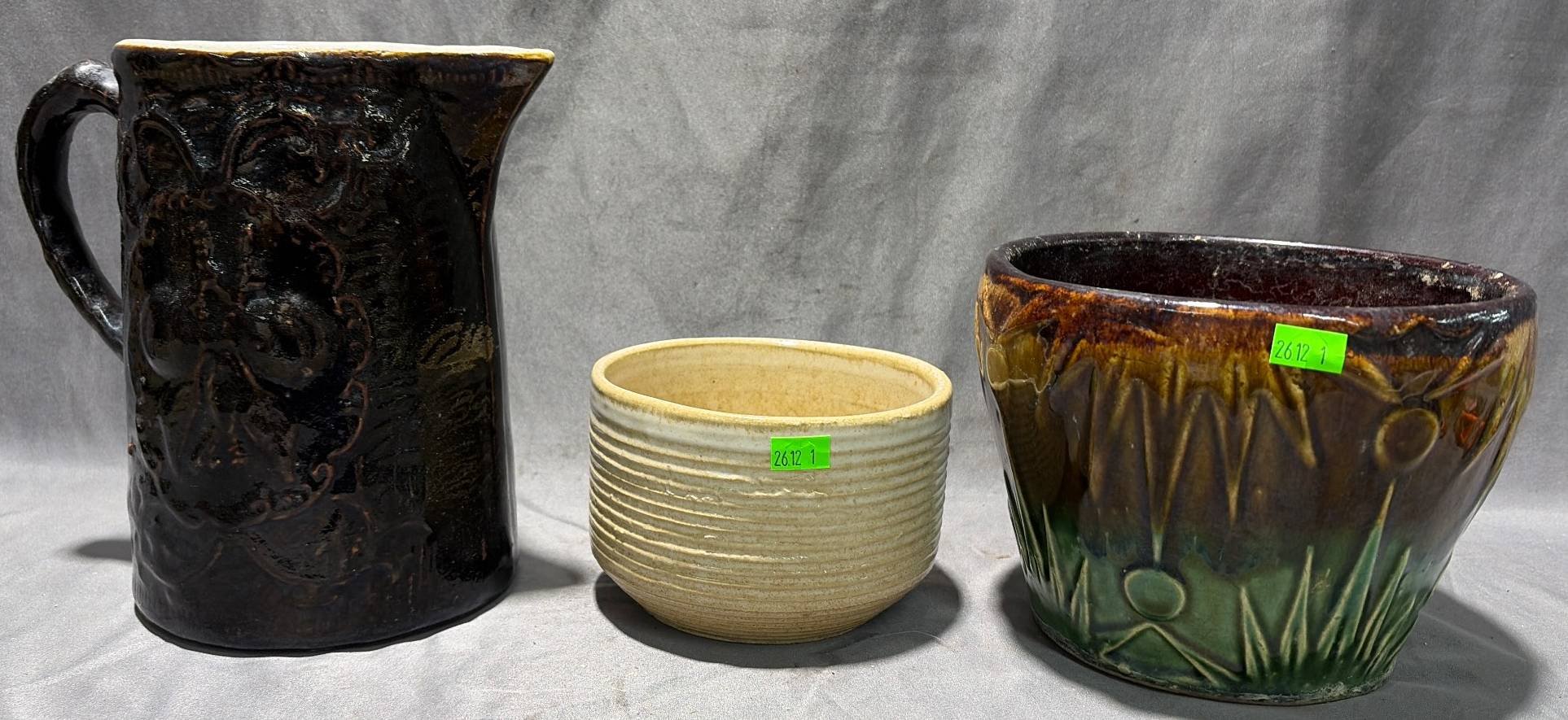 9308 Ceramic Planter with Bamboo Motif, Plastic Sprayer, and Fishing Tackle Box