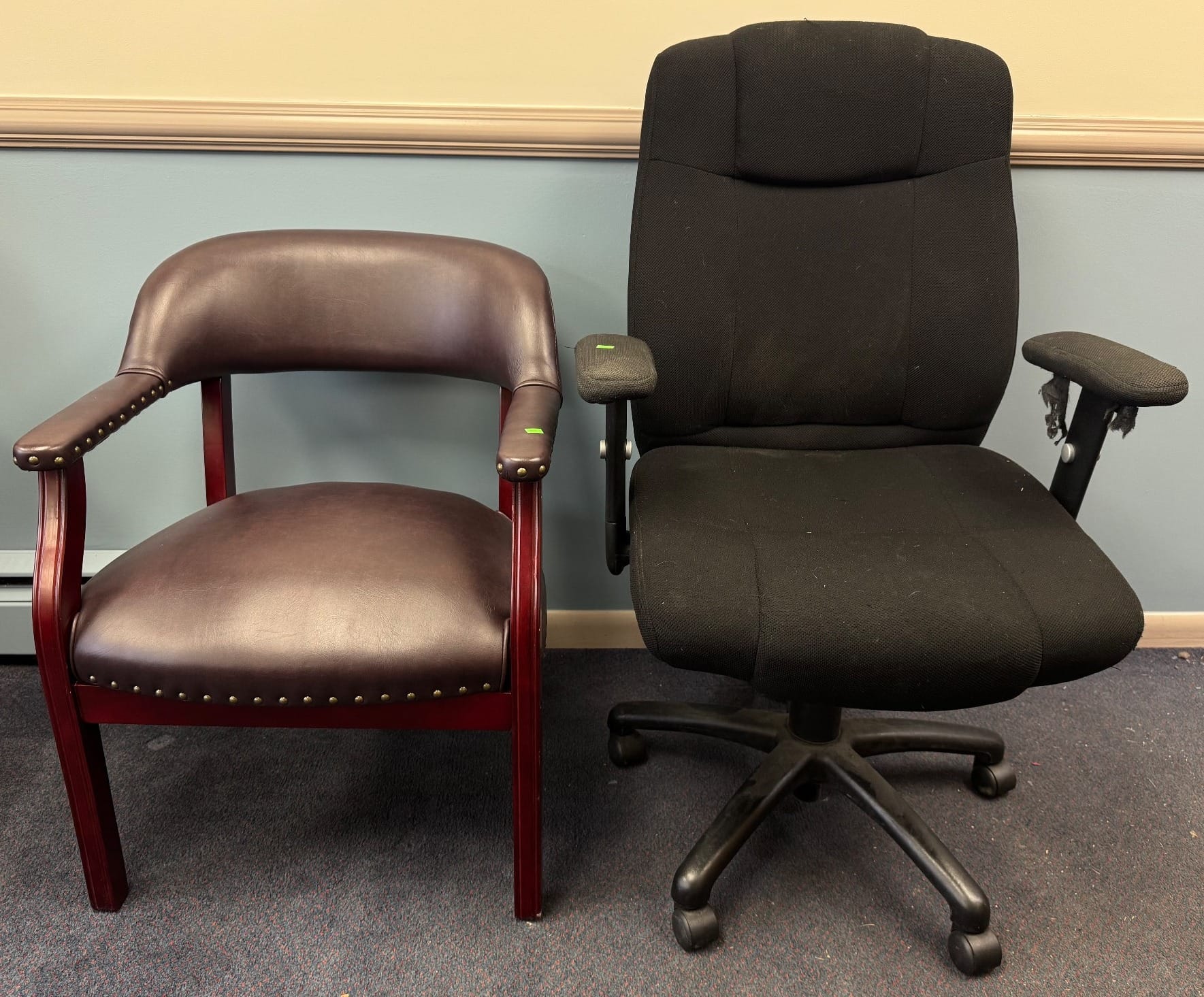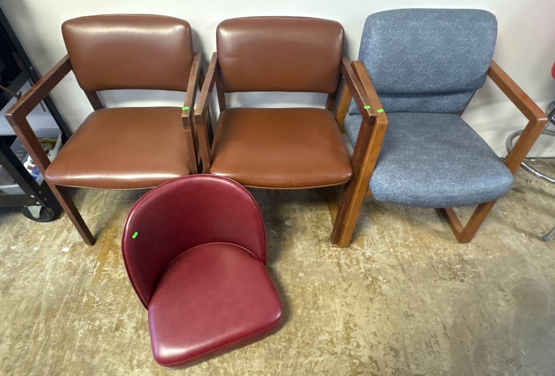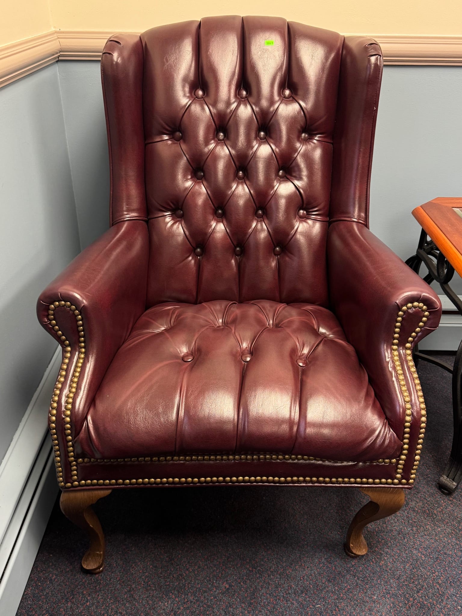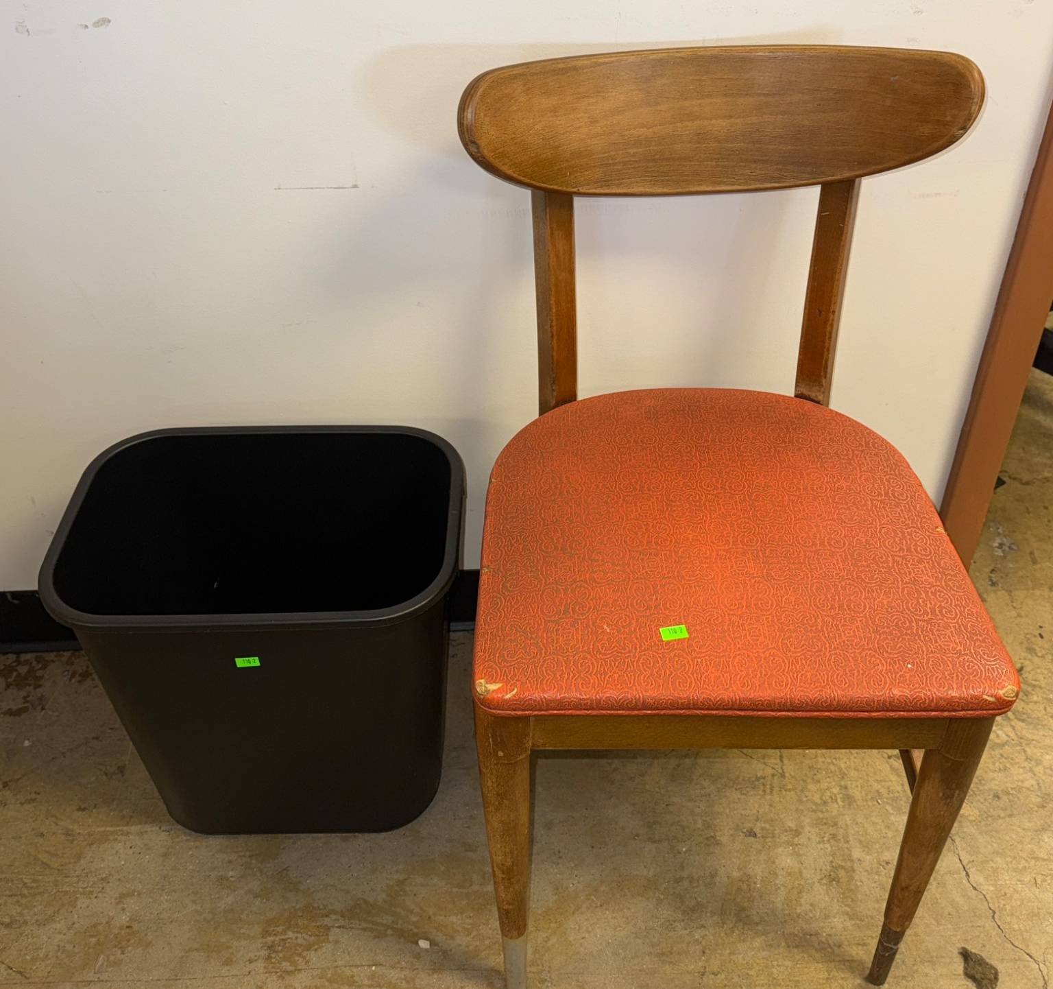 110 Wood Frame Chair With Red Upholstered Seat and Black Plastic Wastebasket 15”-30”