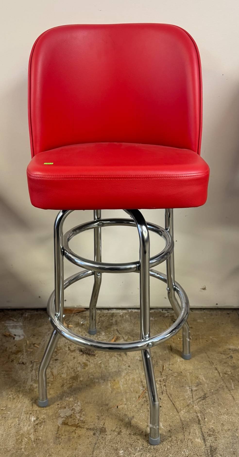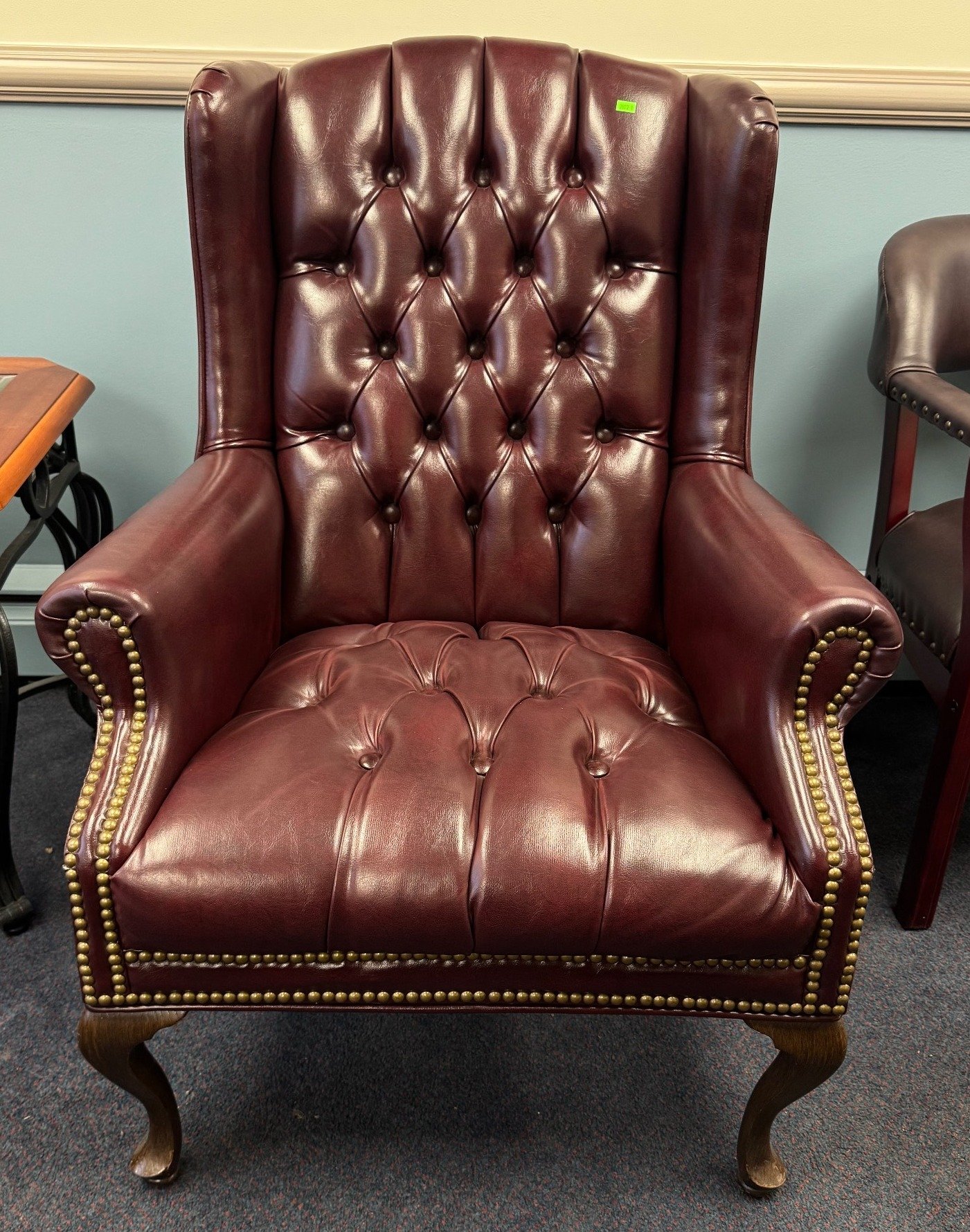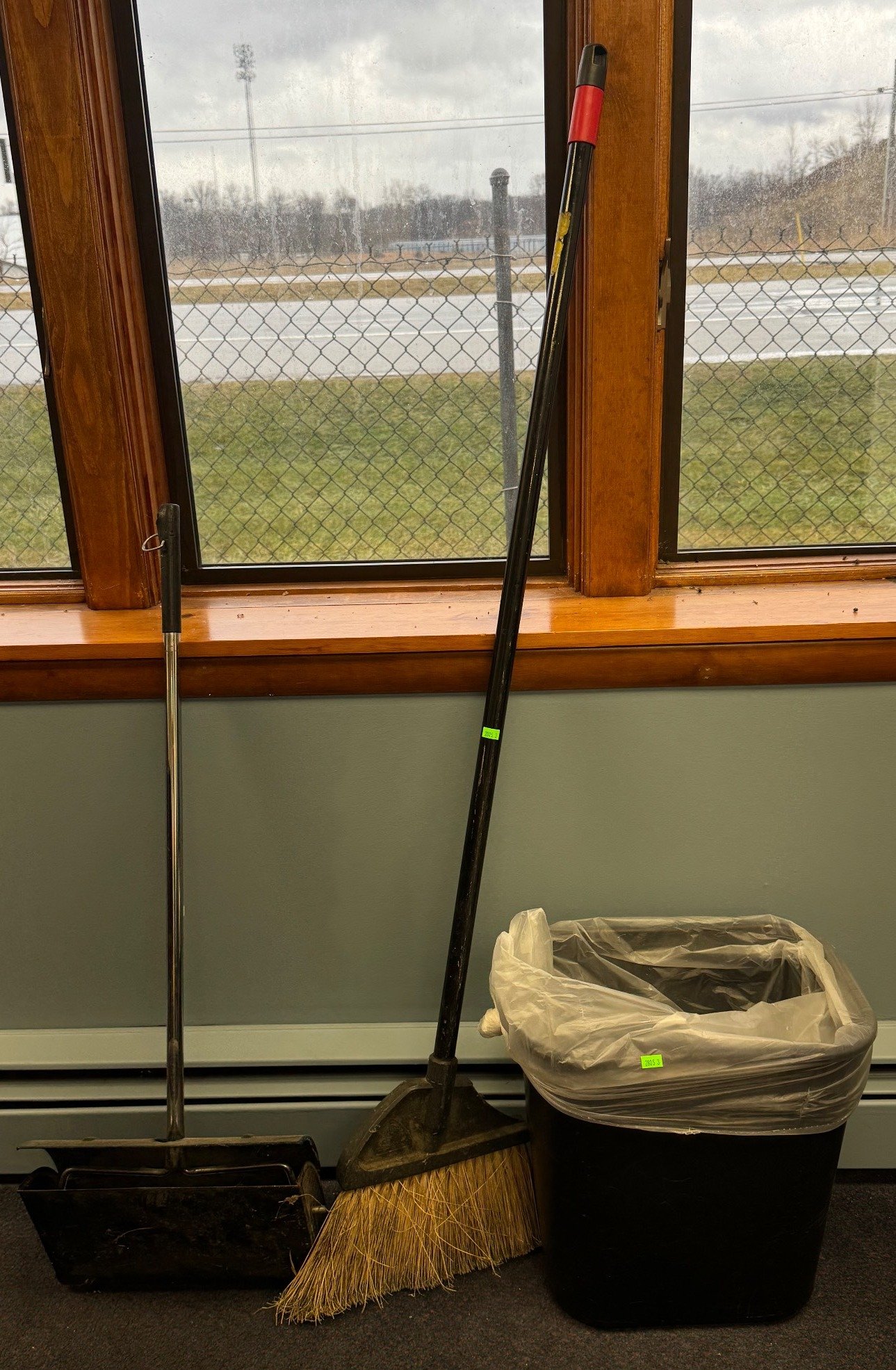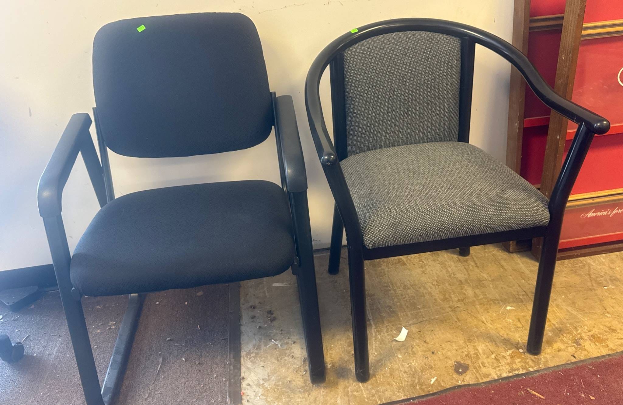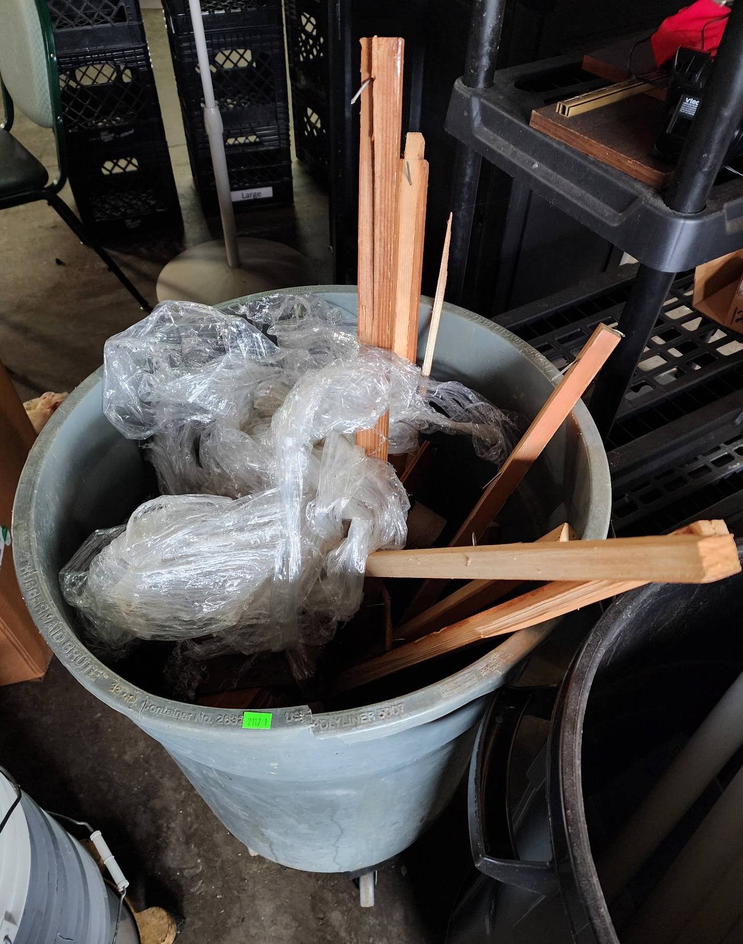 110 Wood Frame Chair With Red Upholstered Seat and Black Plastic Wastebasket 15”-30”