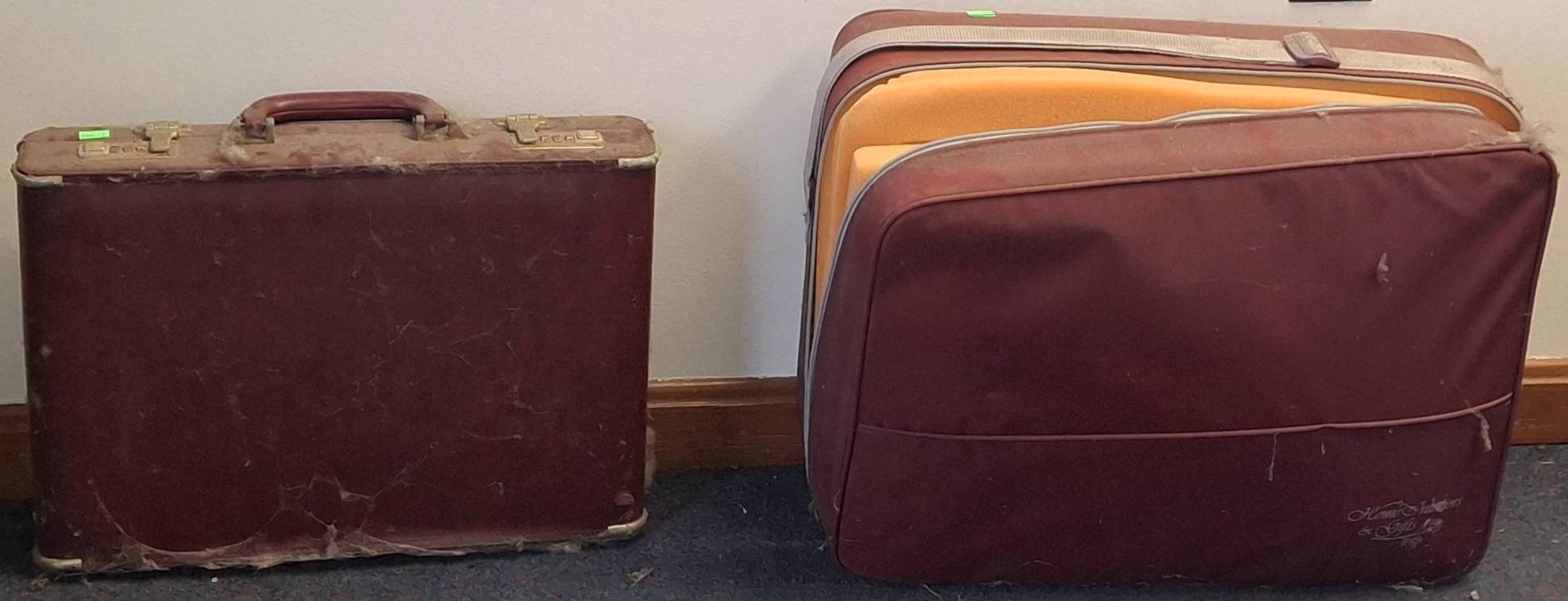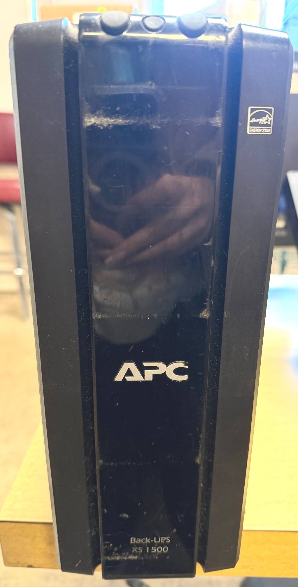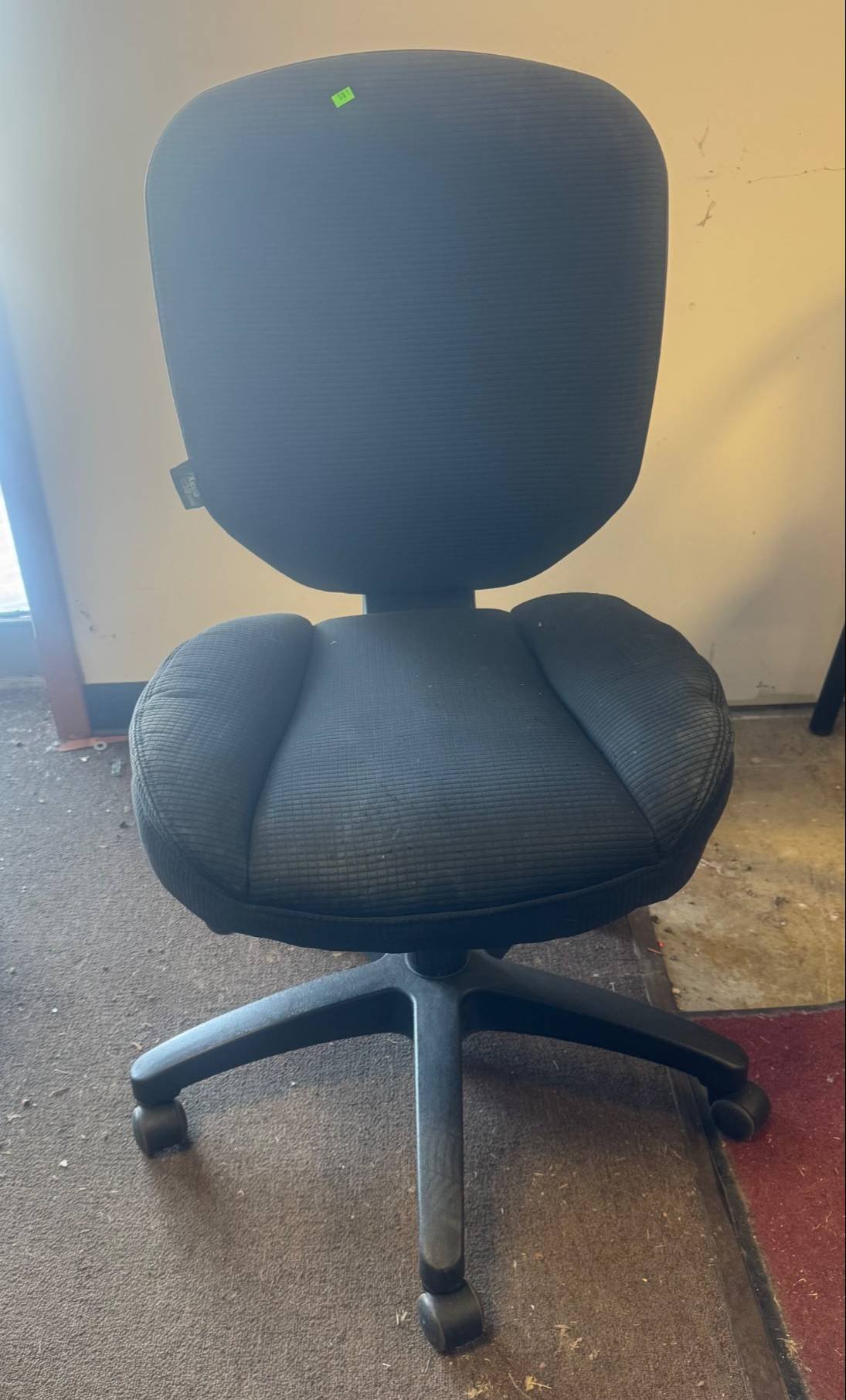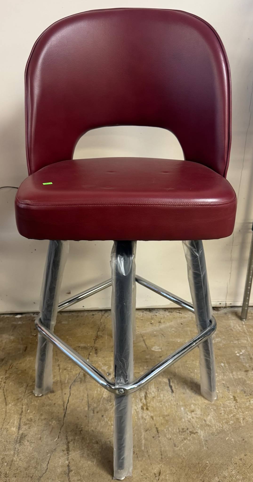 110 Wood Frame Chair With Red Upholstered Seat and Black Plastic Wastebasket 15”-30”