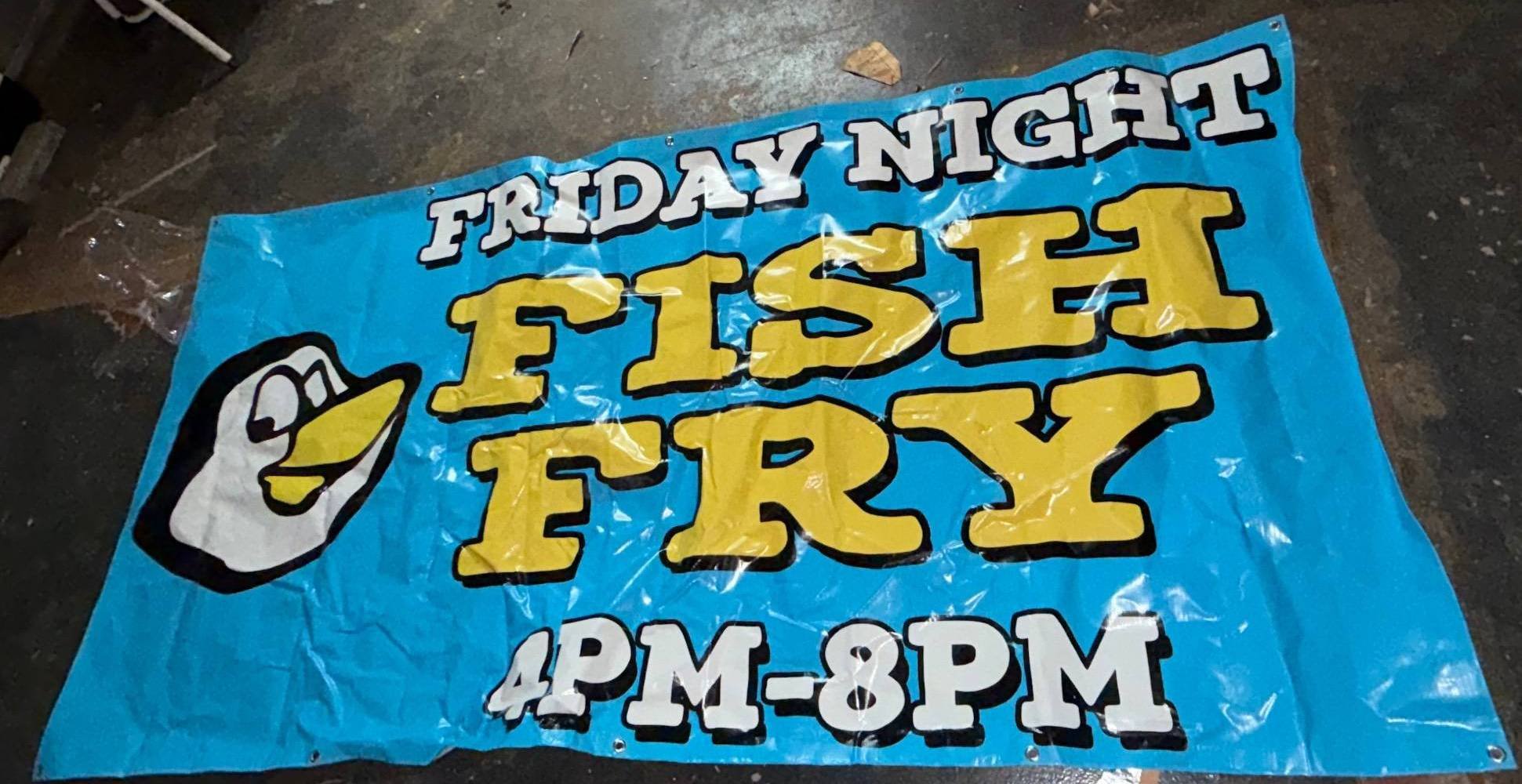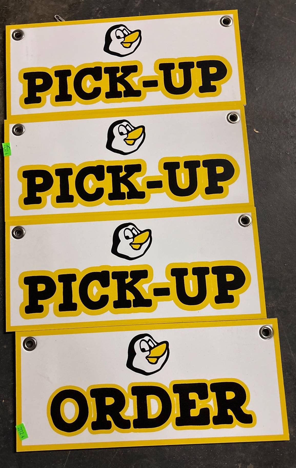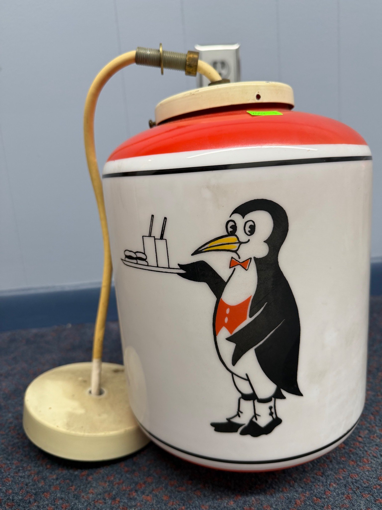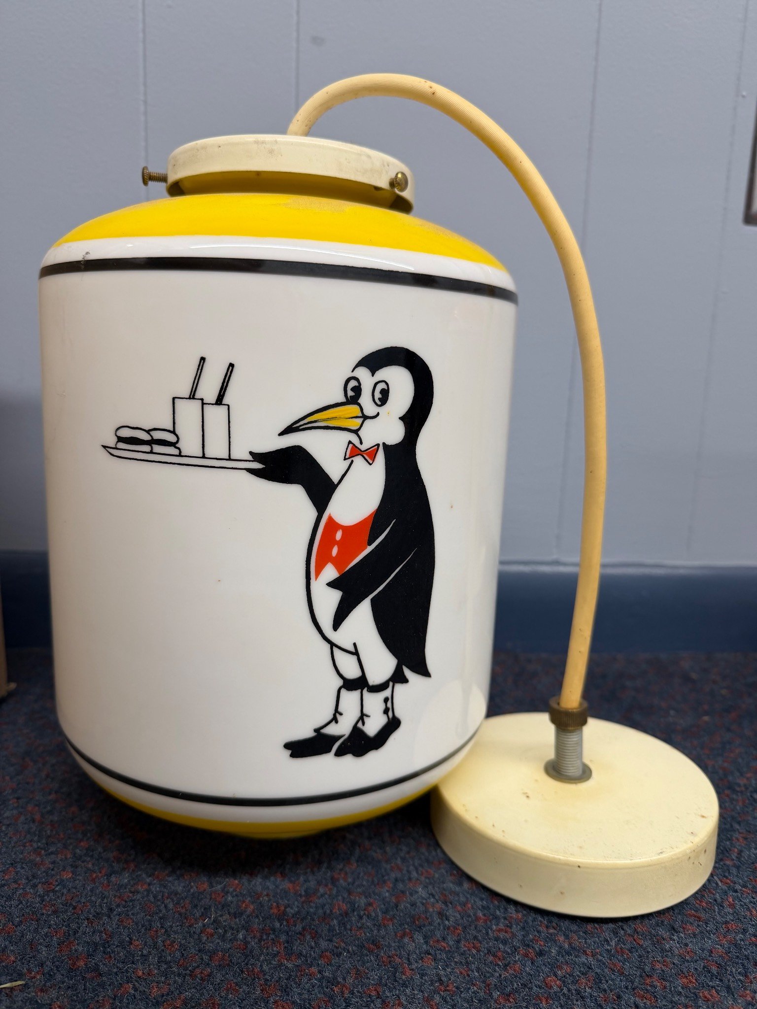 7081 Yellow Metal Advertising Sign with Illustrated Penguin Graphic