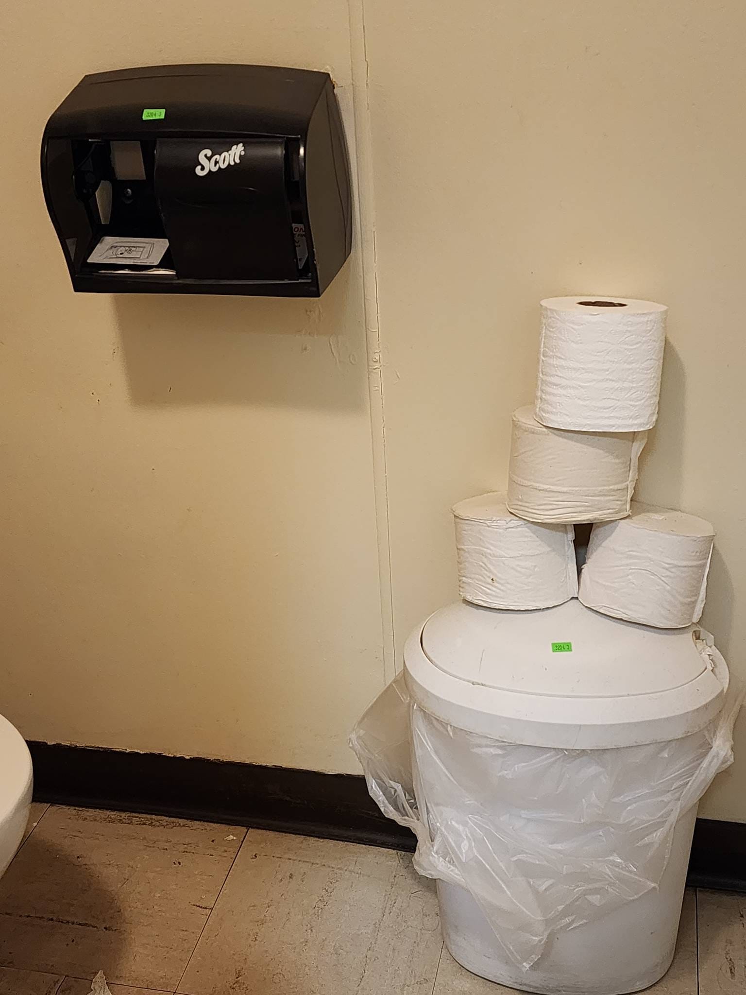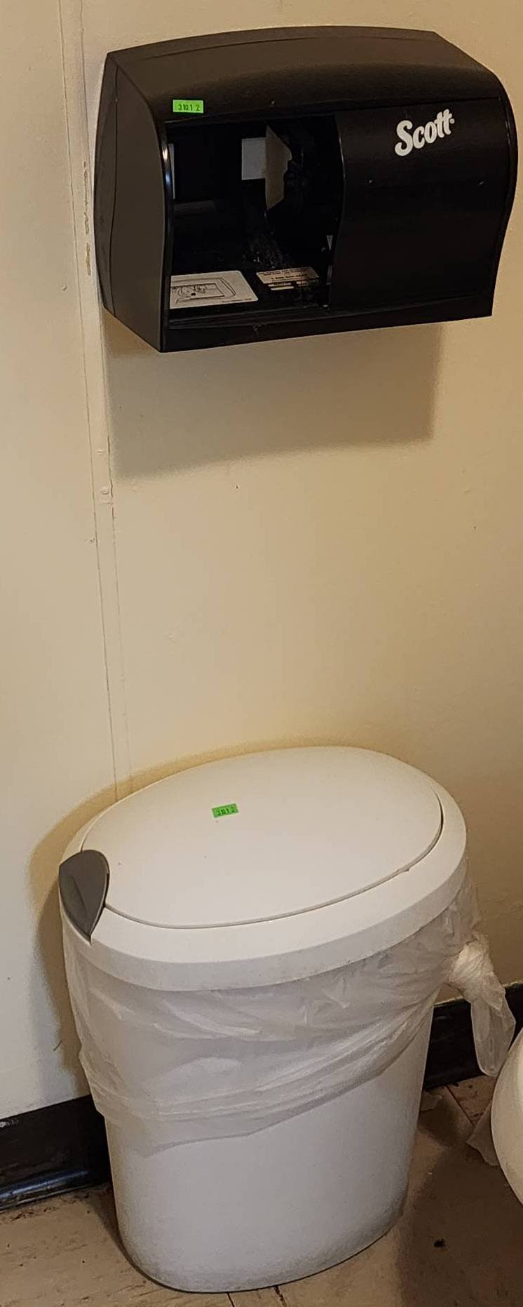 3101 Scott Dual Roll Toilet Paper Dispenser and Plastic Trash Can 10? x 8?, 14? x 17? – BUYER TO REMOVE FROM WALL