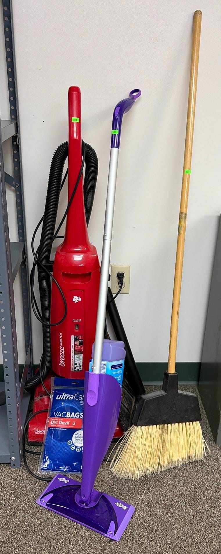 3401 Cleaning Tools Lot Featuring a Dirt Devil Vacuum and Mop, Untested