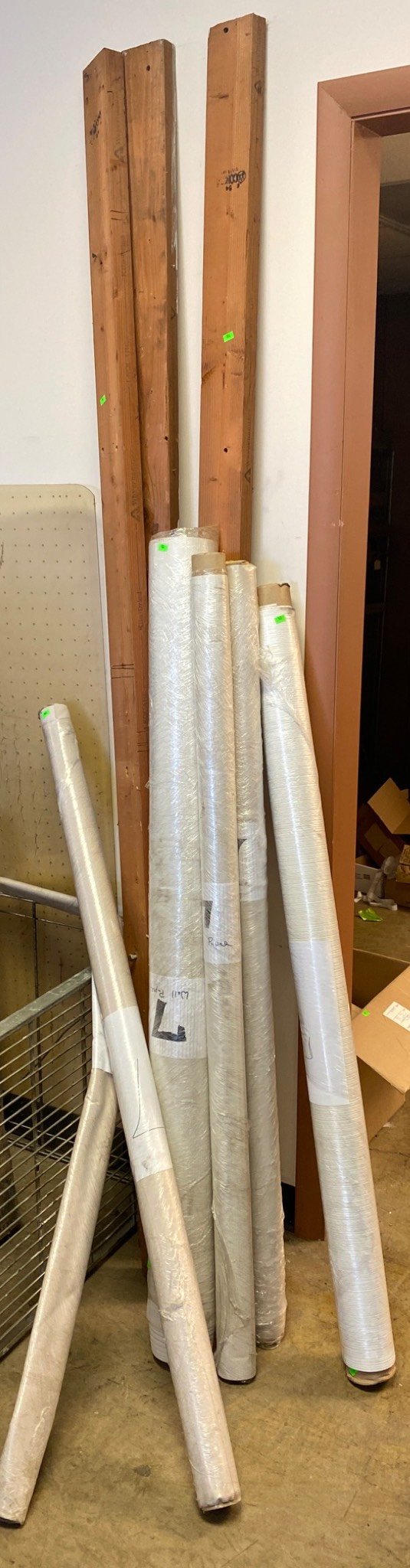 103 6 Rolls of Wall Paper and 3 Wood Beams 54”-58”, 4”x85”