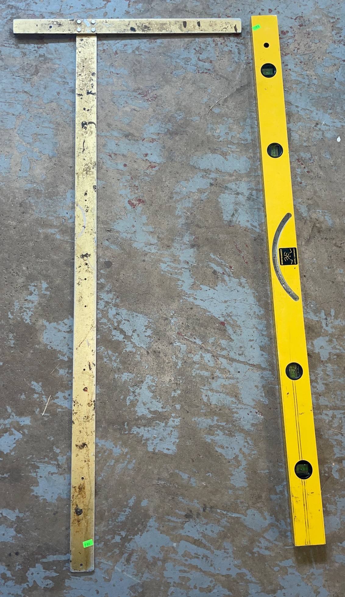 138 Montgomery Level Co. Yellow Spirit Level and Brass Measuring Square, 48 – 50?