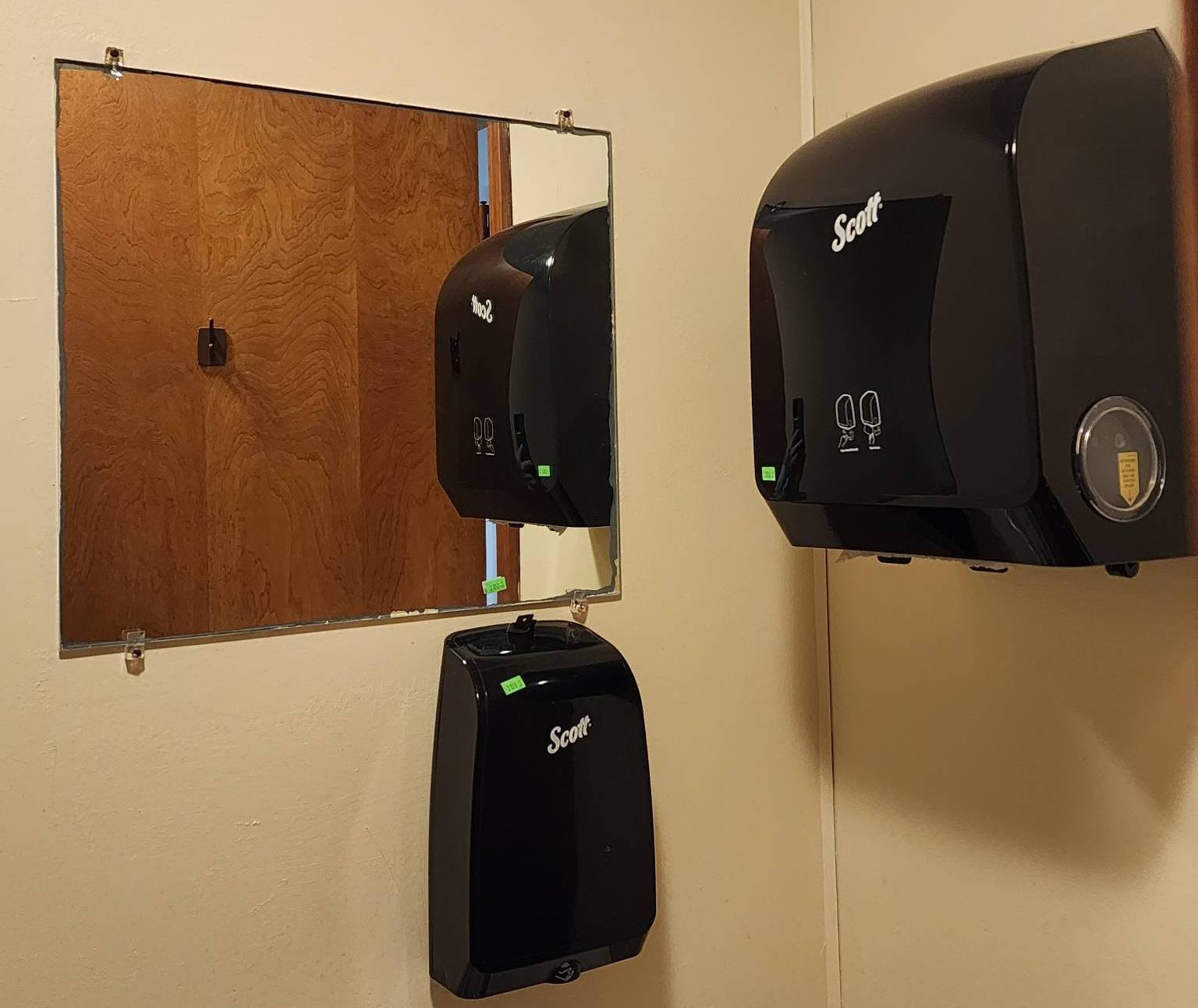 3102 Scott Brand Soap Dispenser, Towel Dispenser, and Mirror with Mounting Hardware 7? x 12?, 12? x 9? x 16?, 20? x 18? – BUYER TO REMOVE FROM WALL
