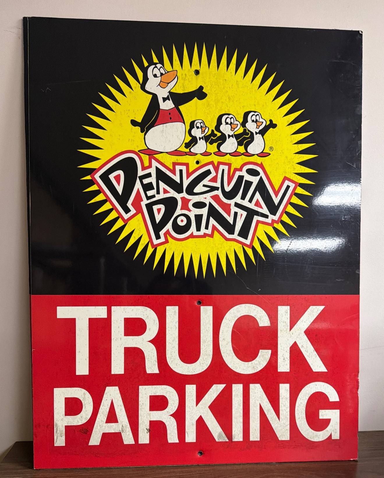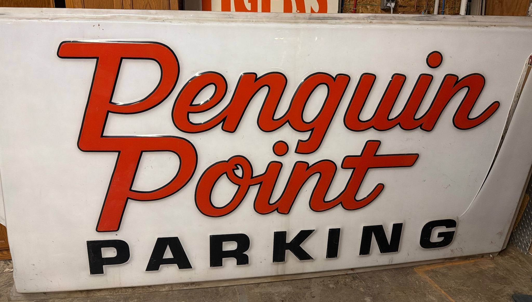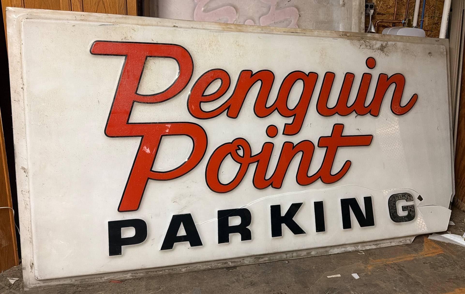 7076 Penguin Point Parking Sign with Red Lettering - CRACK ON RIGHT SIDE 96x48"