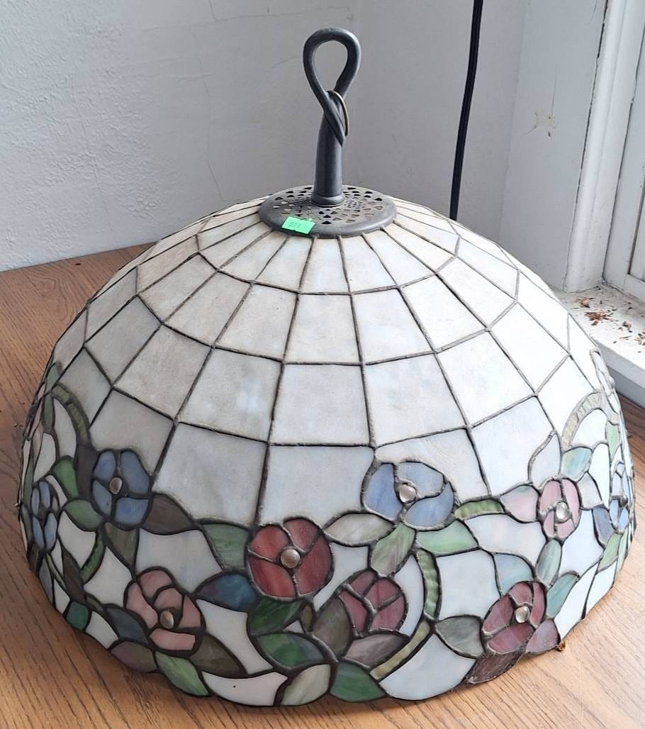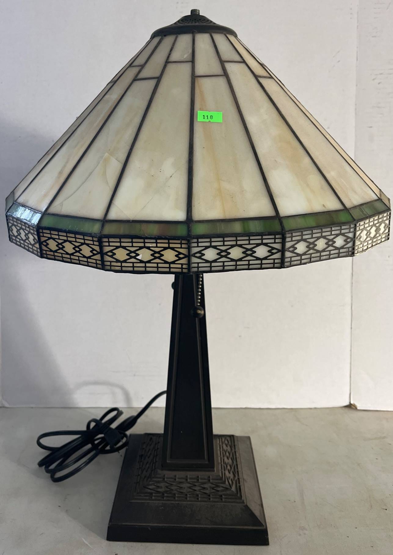 119 Table Lamp With Stained Glass Shade and Metal Base – Cracked, Hole in 1 Panel 16”