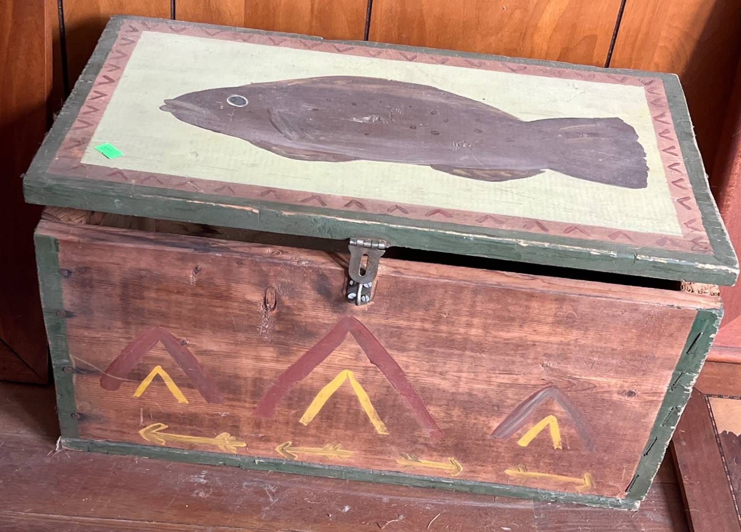 303 Painted Storage Chest with Fish Design and Hinged Lid 20x11x10.5?