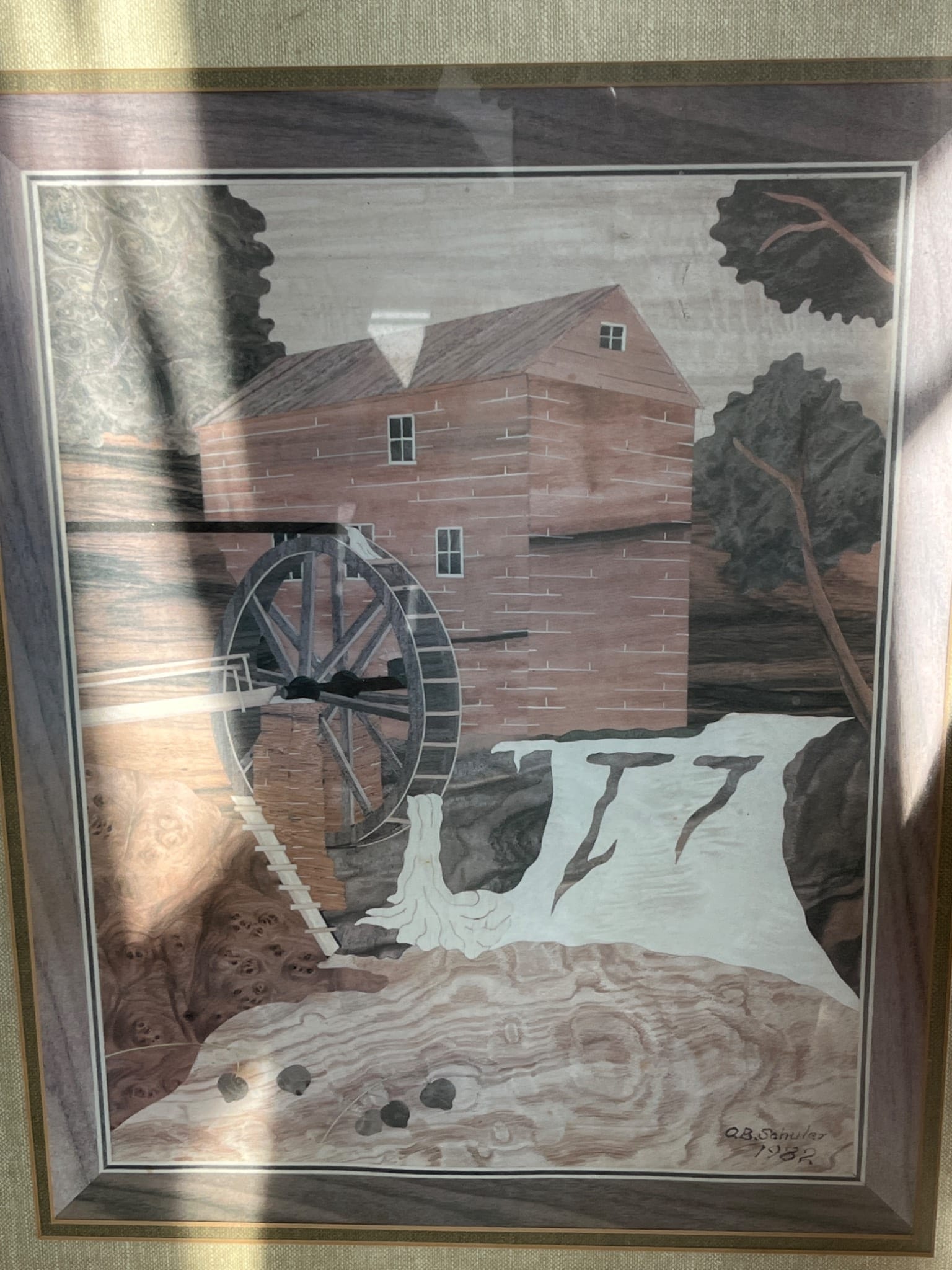 305 Framed Marquetry Artwork Depicting a Water Mill by Q.B. Sahuler, 1982 21.5×25?