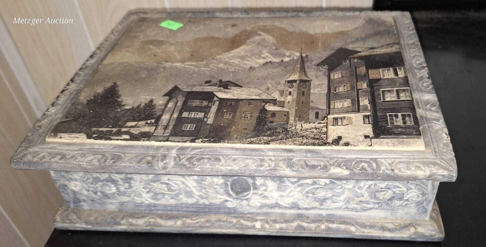 713 Soapstone Box with Engraved Scenic Design and Hinged Lid – Needs Repair 11×8.5×3?