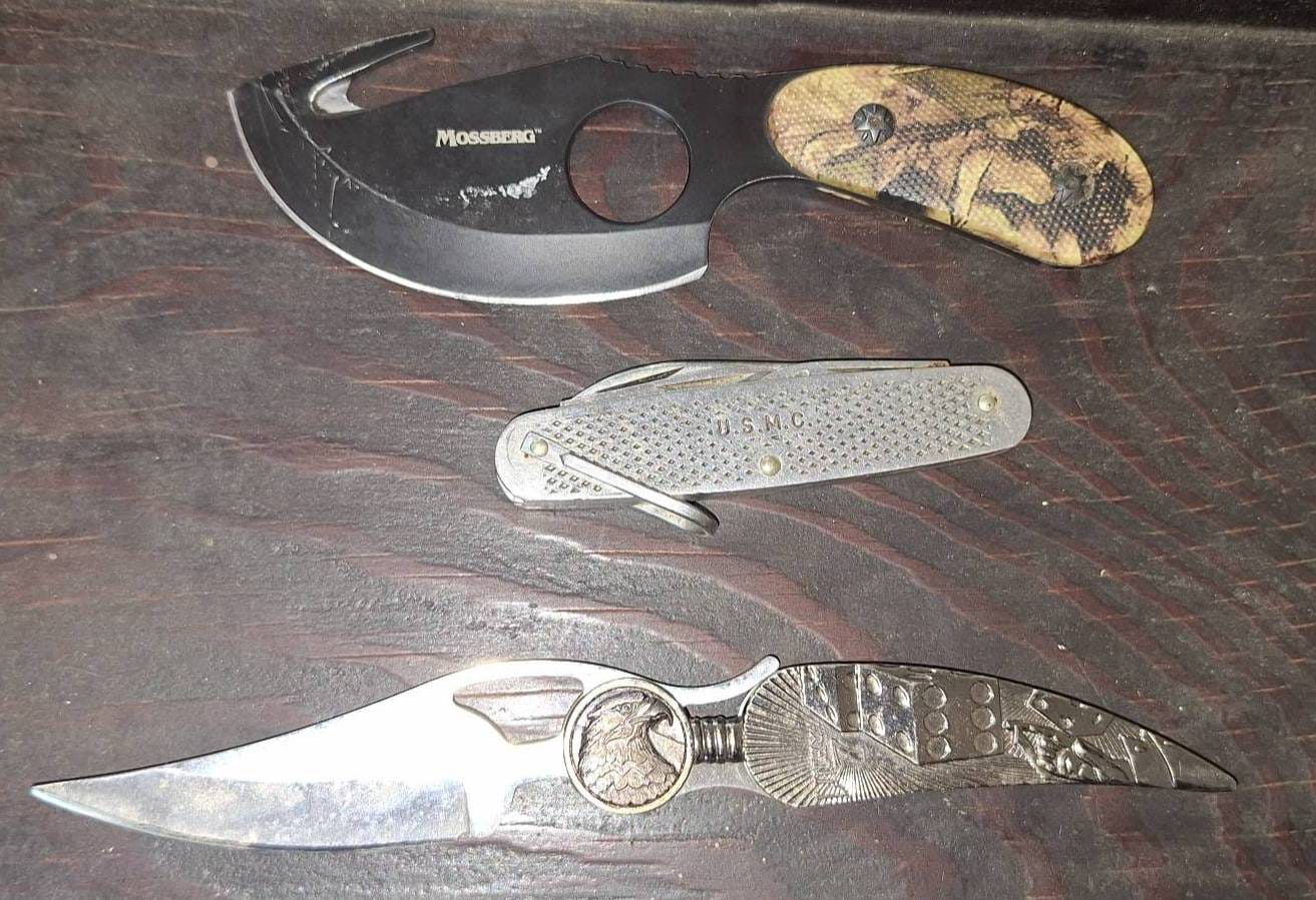 714 Wood Box with 3 Folding Knives Inc. Mossberg and USMC