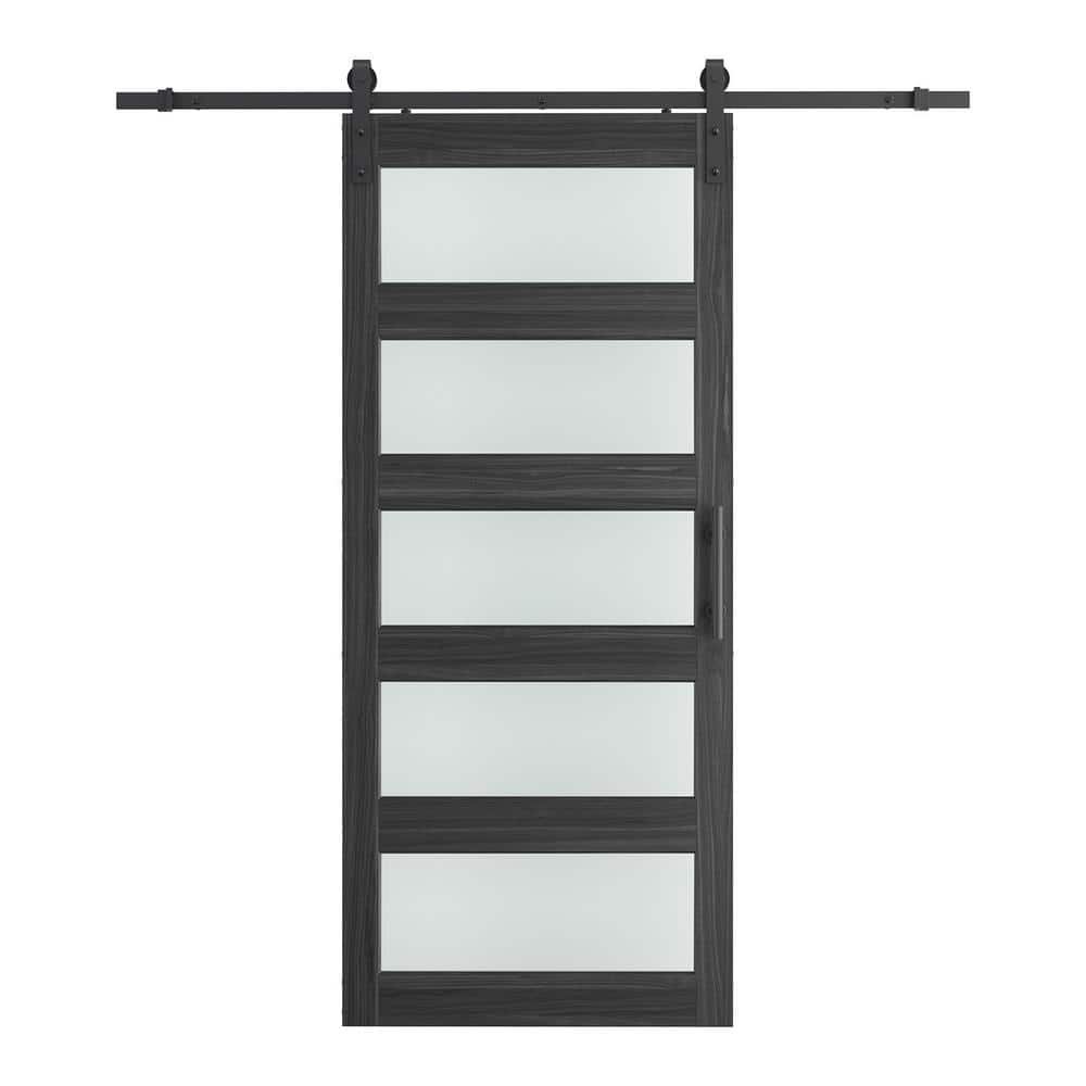 671071 SOCBAZZAR - 36 in. x 84 in. 5-Panel Frosted Glass Classic Gray Prefinished MDF Interior Sliding Barn Door with Hardware Kit