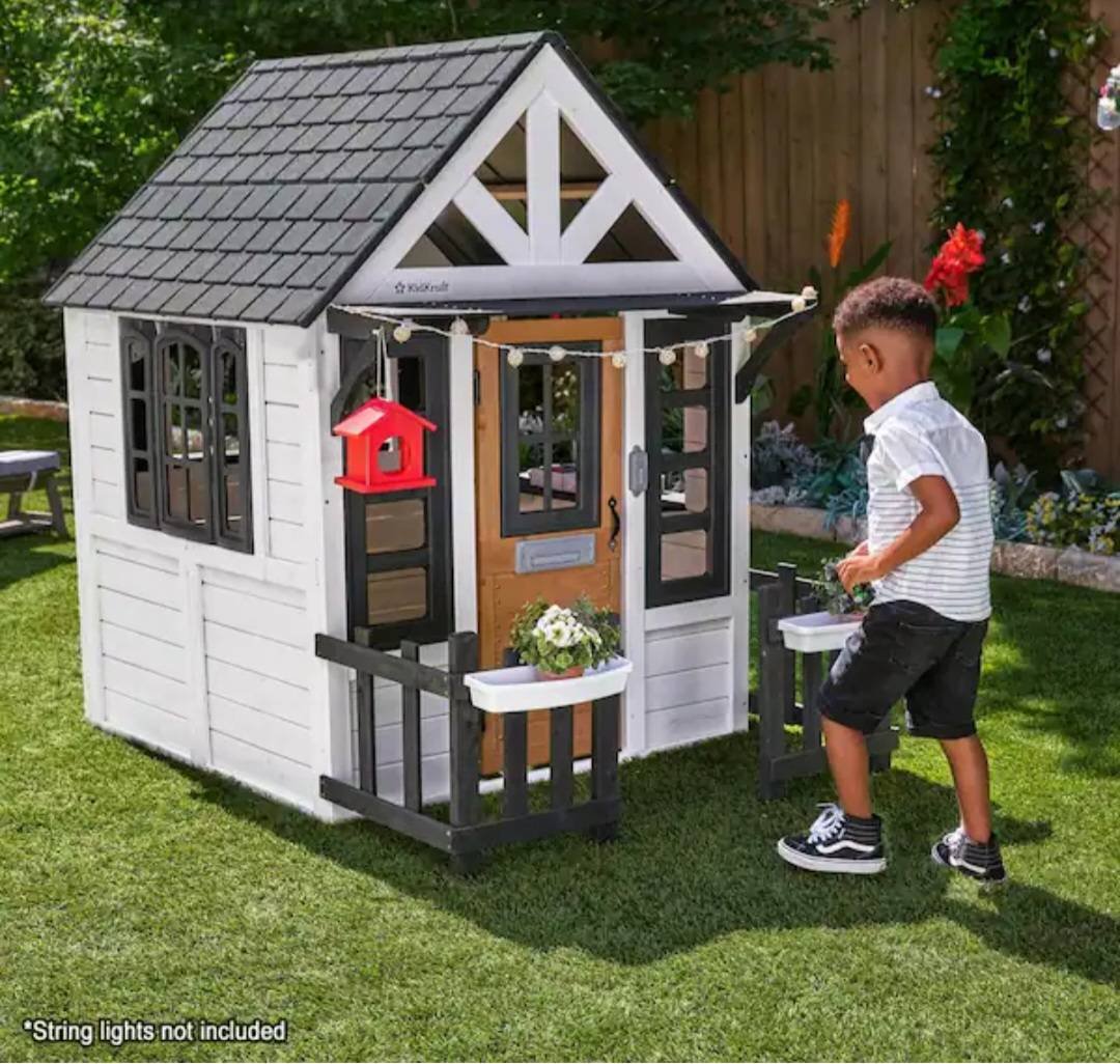 529 KidKraft Riverscape Outdoor Wooden Playhouse with Working Doorbell, Fence, Kitchen, and Pet Door-White