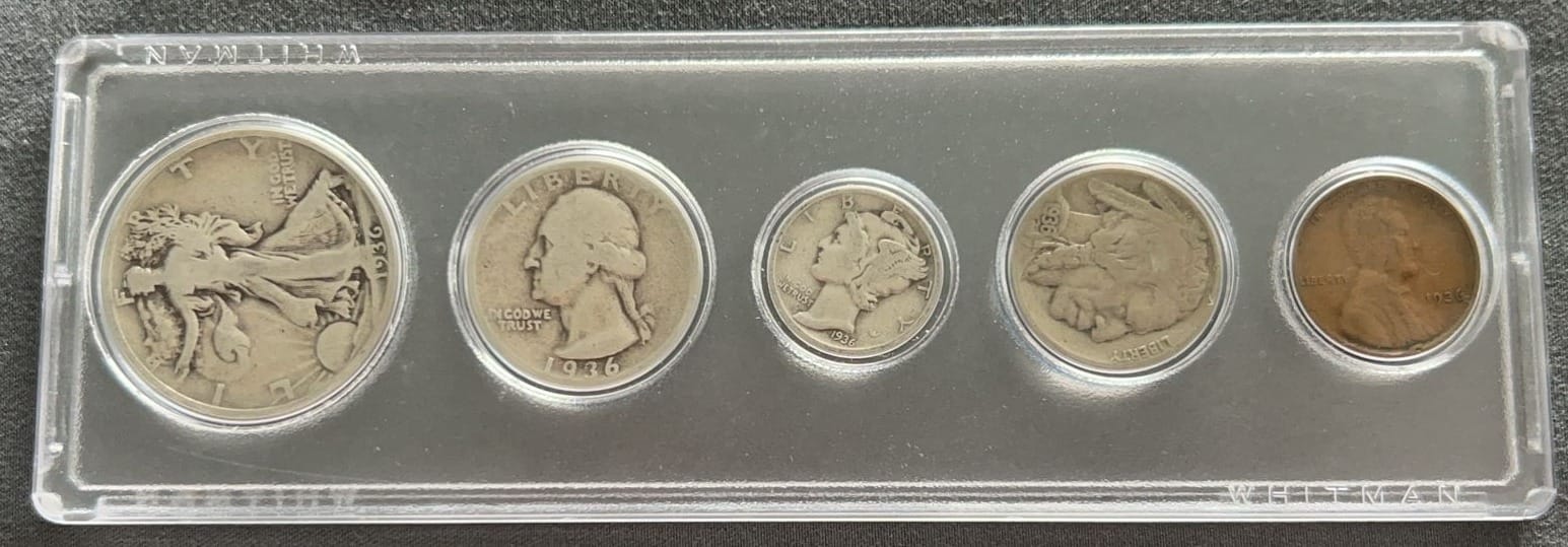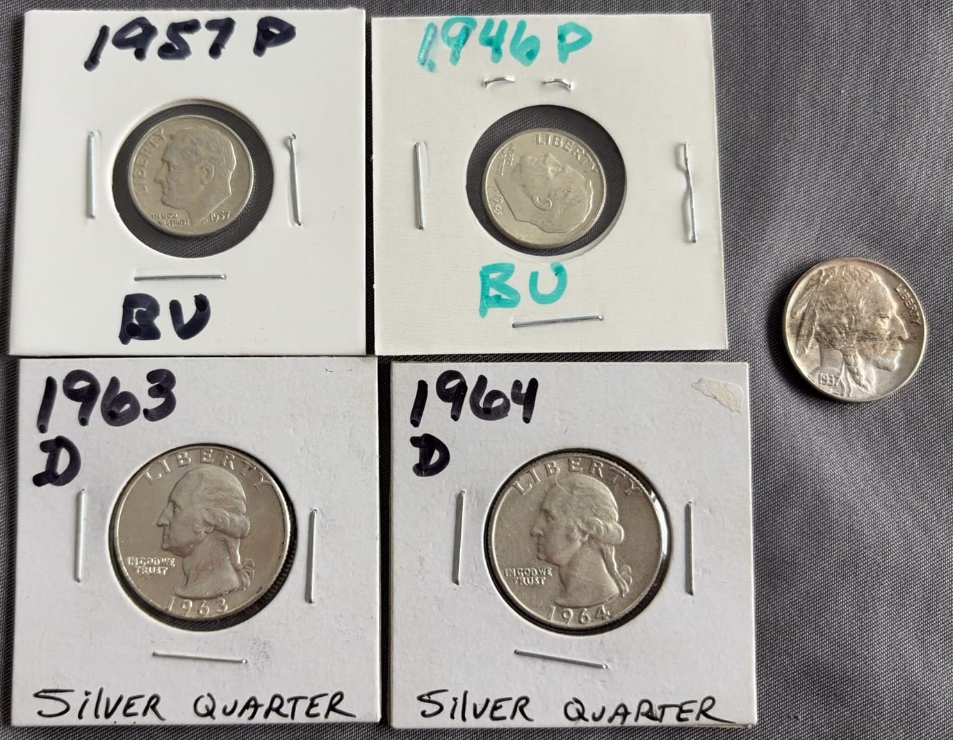3436 (2) Roosevelt Dimes 1946-P, 1957-P BU, (2) Washington Quarters 1963-D, 1964-D, (1) 1937-S Buffalo Nickel