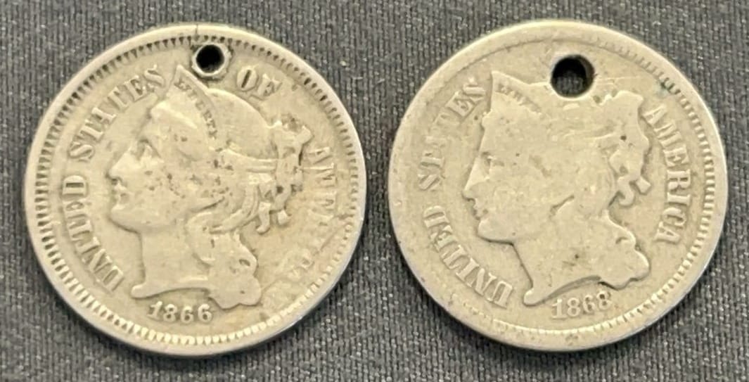 3520 2 - 3 Cent Nickels 1866-1868 (Have Holes)