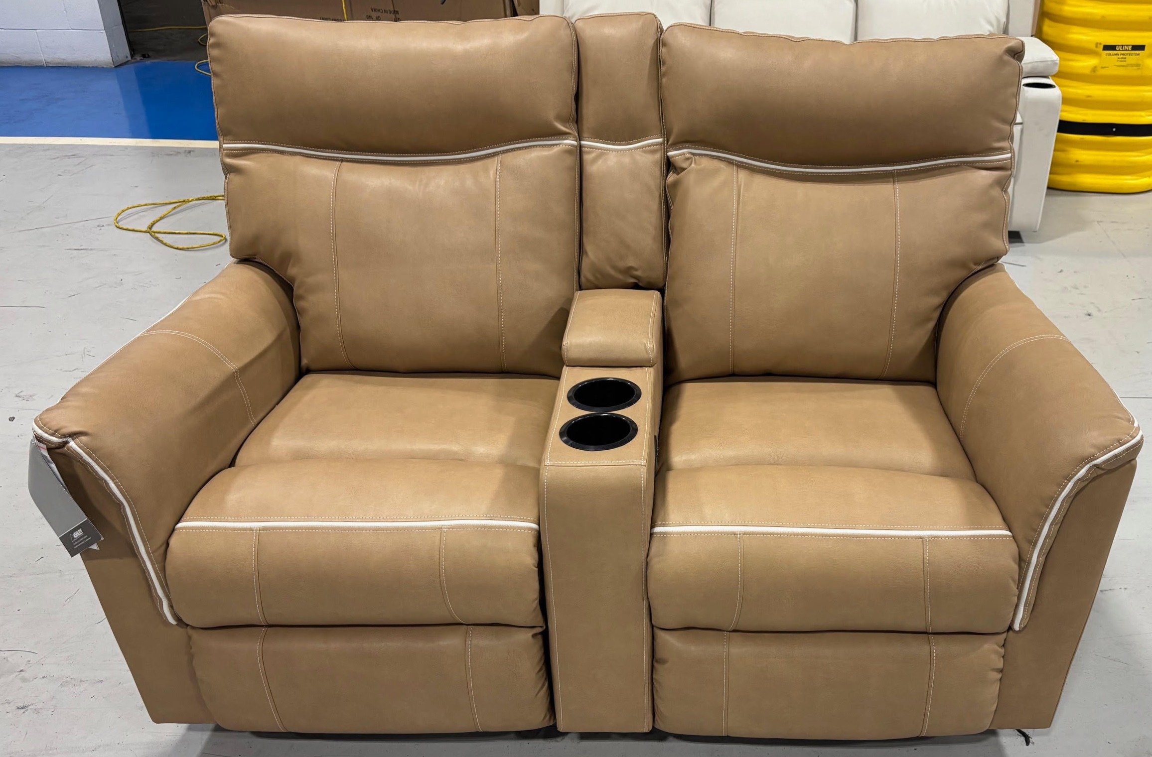 469 Ashley Furniture Powered Brown Faux Leather Reclining Loveseat with Center Console and Cupholders- 59" 202402301