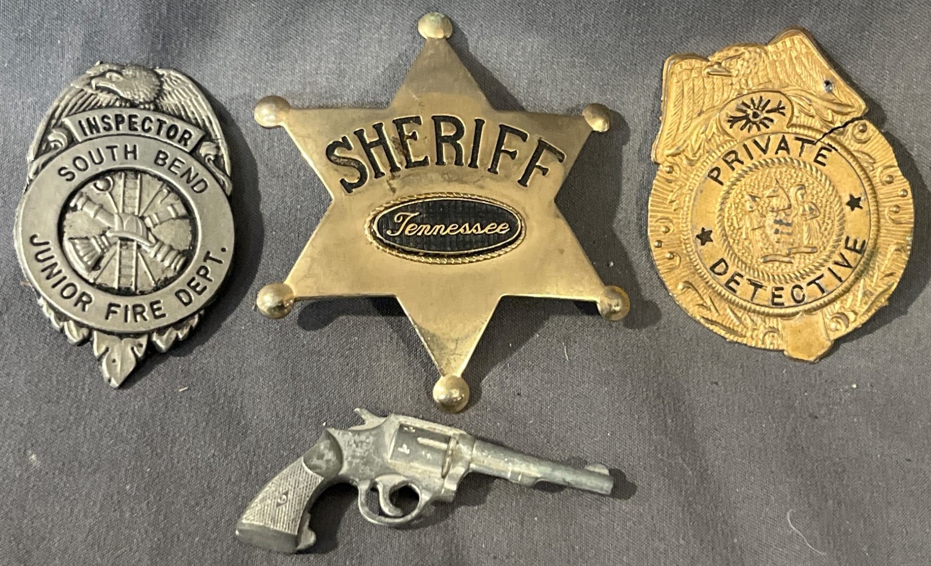2011 3 Metal Badges and 1 Cast Metal Revolver Toy
