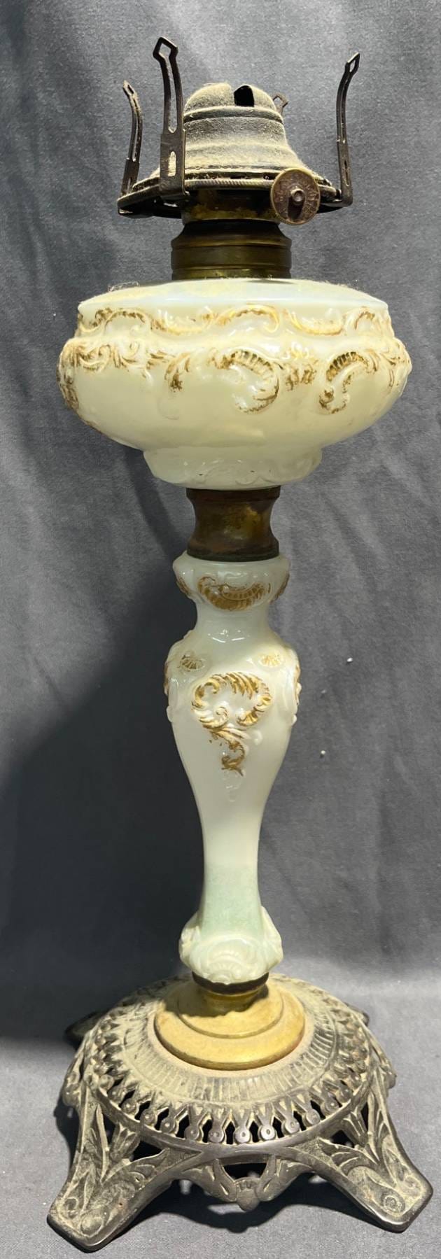 2043 Scoville Glass Kerosene Lamp with Cast Base and Decorative Embellishments, 13?