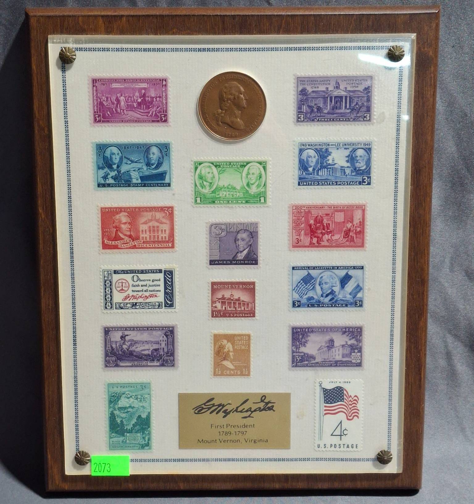 2073 Framed George Washington-Themed Display with U.S. Stamps and Bronze Medallion 8?x10.5?