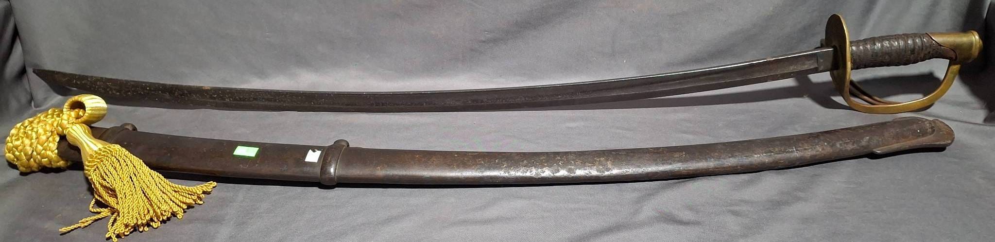 2079 Sword with Brass Hilt, Curved Blade, and Sheath with Gold-Tone Tassel -34.5? Blade Lgth. (some tarnishing)