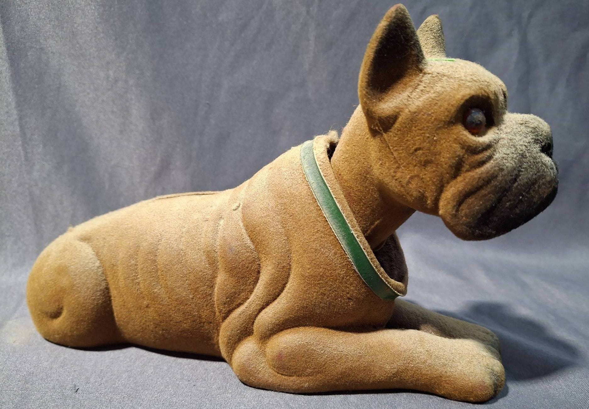 2089 Flocked Boxer Dog Figurine with Coin Slot and Green Collar 8? lgth.