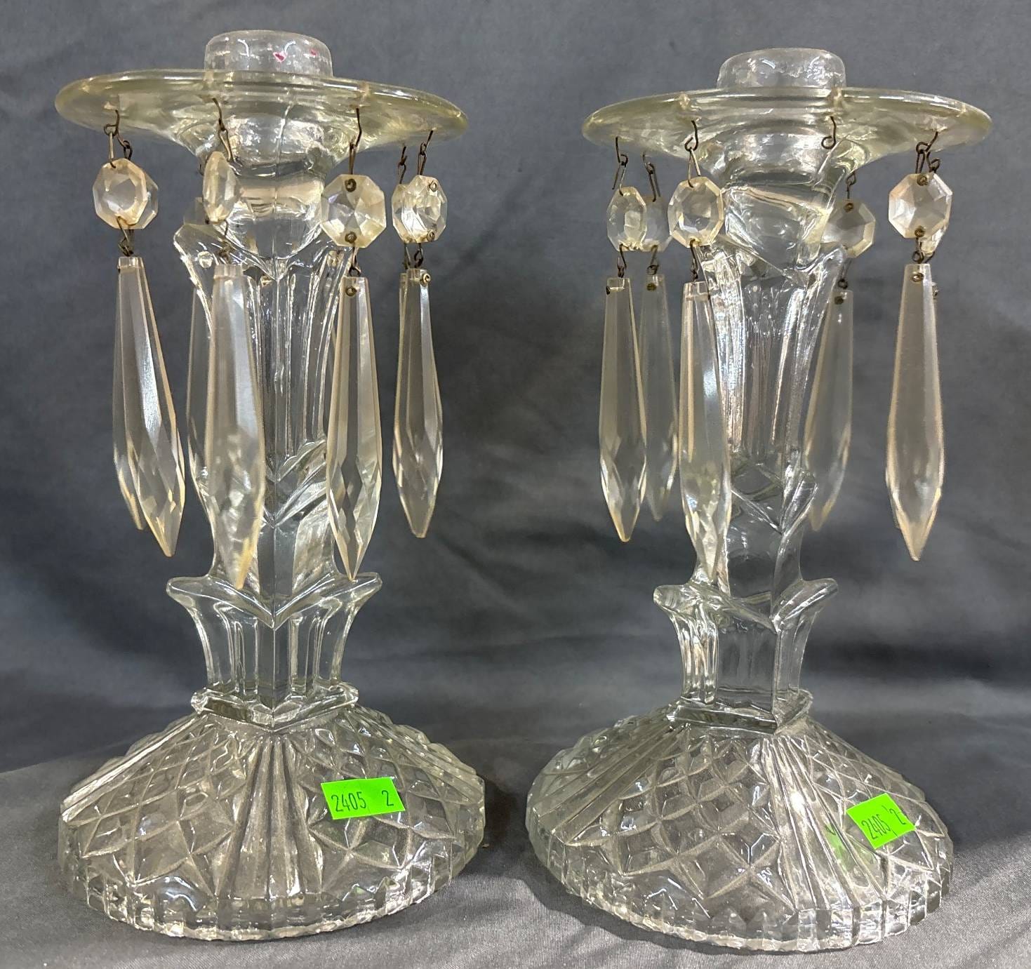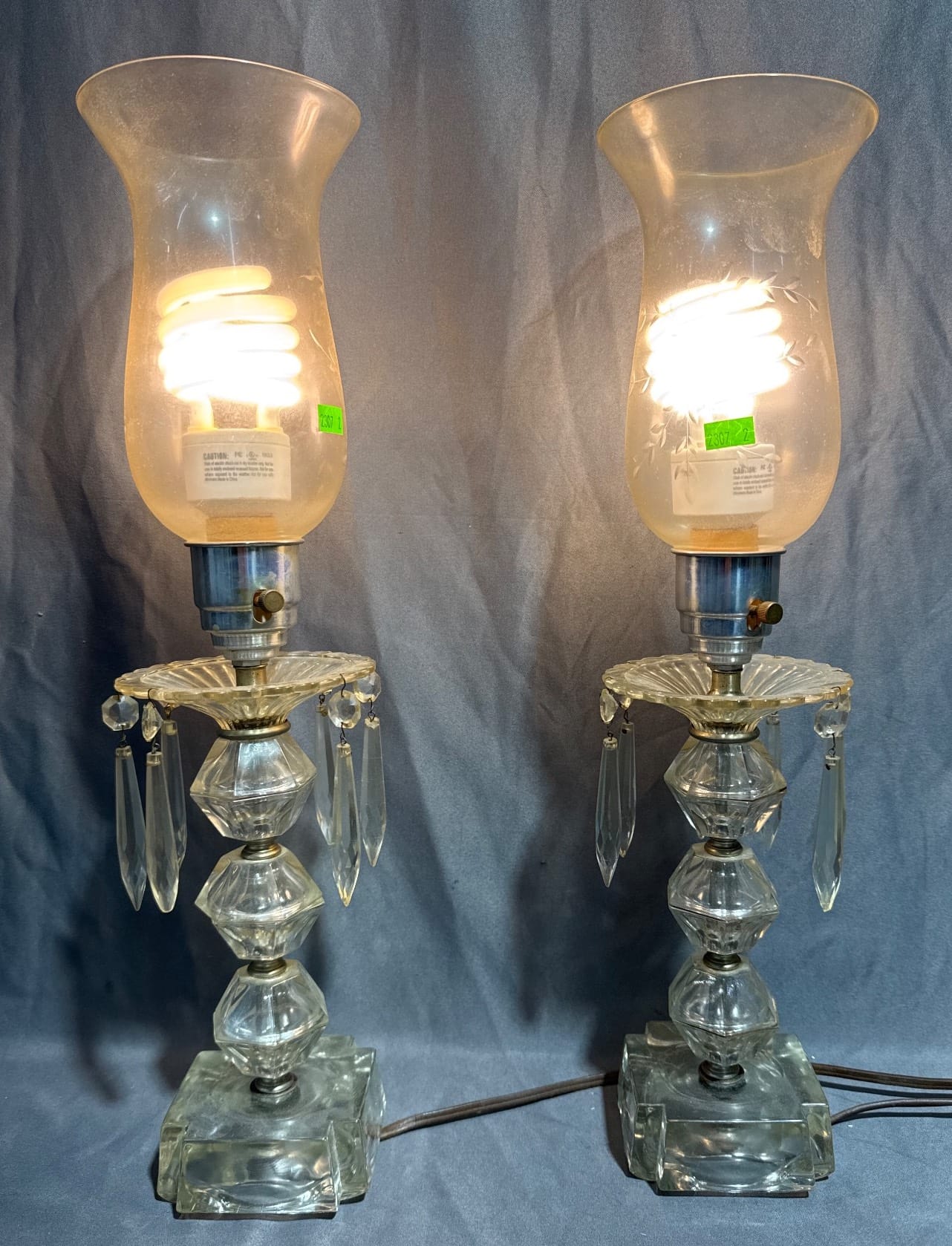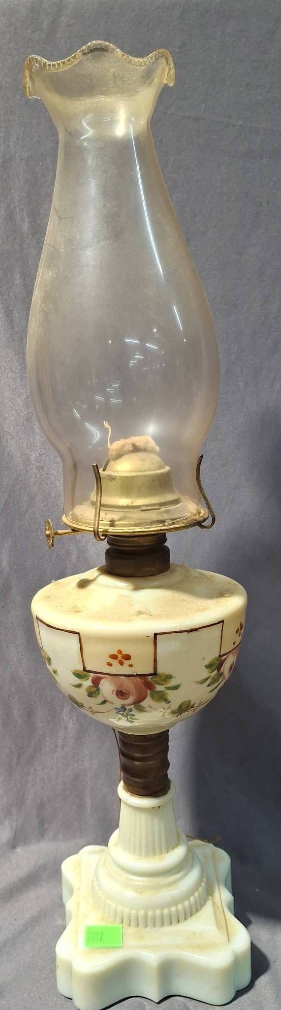 2086 2 – Glass Kerosene Lamps with Brass Burners and Milk Glass Bases 21? Hgt.