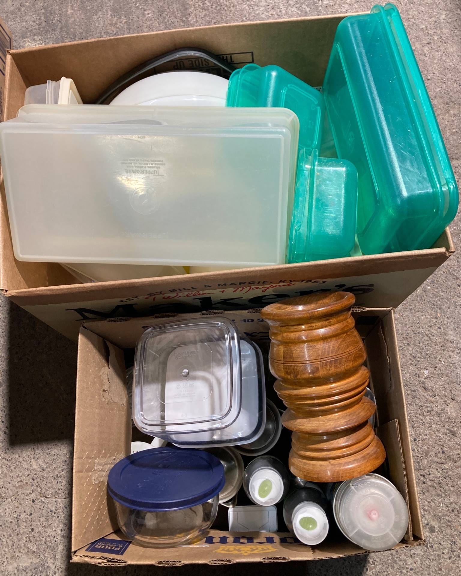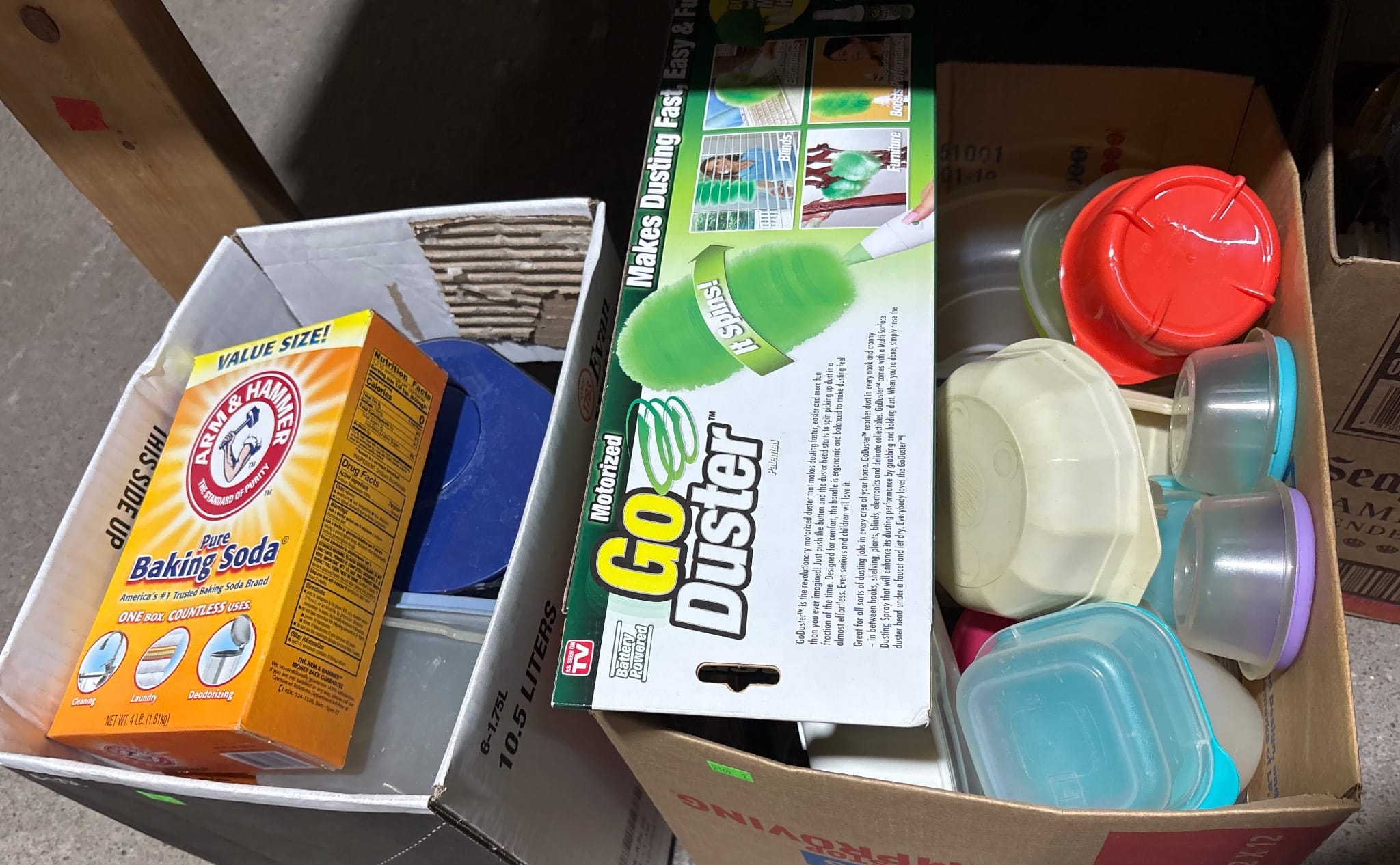 9032 2 16x23” Totes Containing Automotive and Household Items Inc. Dominion Hot Plate, CB Radio and Lawn Pesticides, Partial, Untested