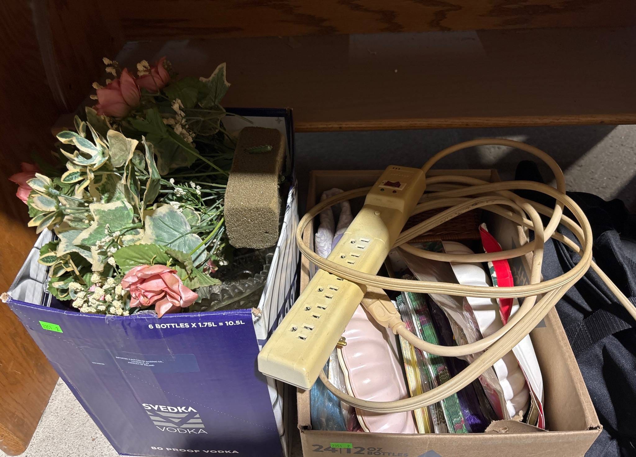 9045 2 Plastic Storage Totes Containing Assorted Glass Bottles, Floodlights & Tablets