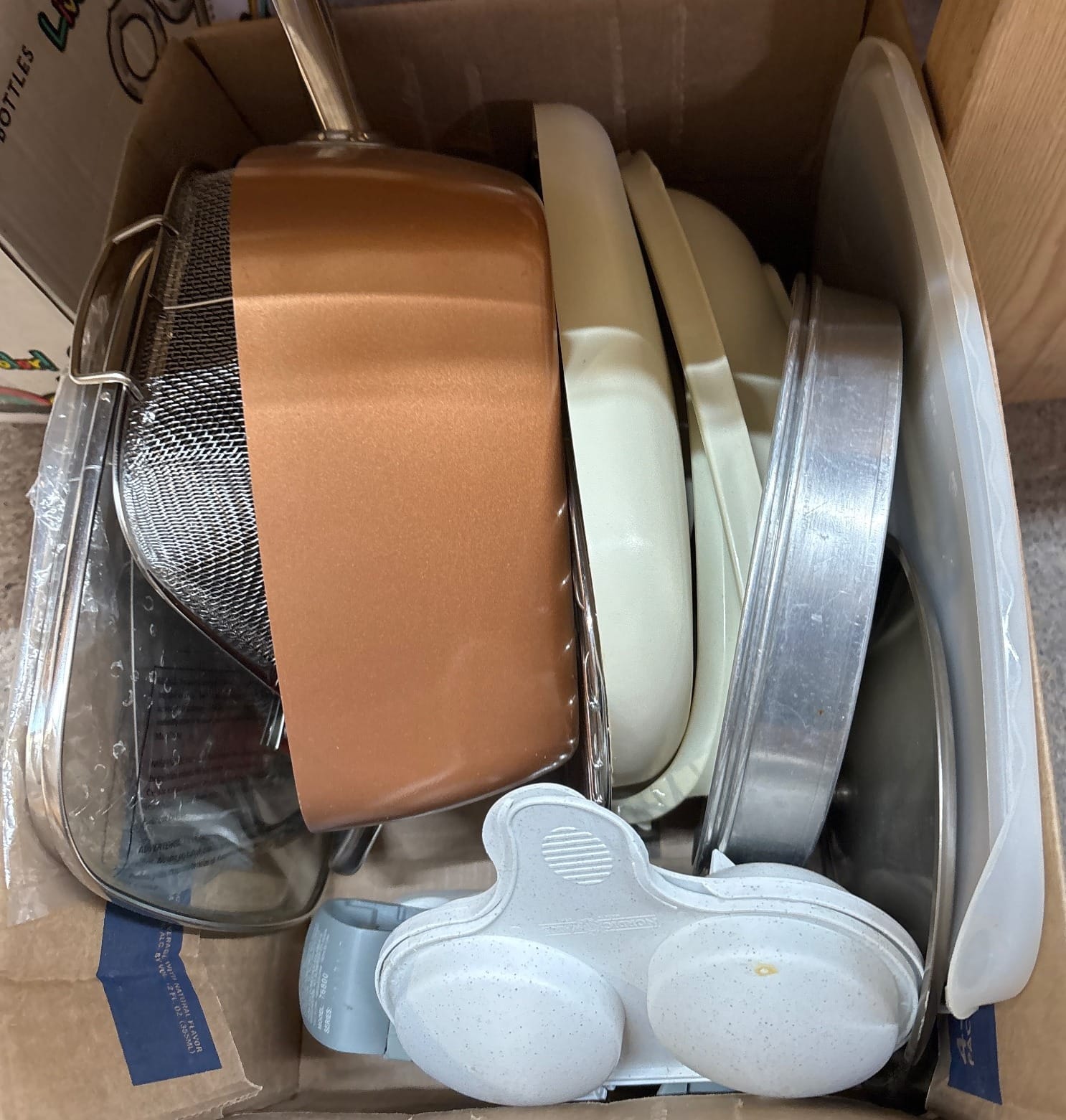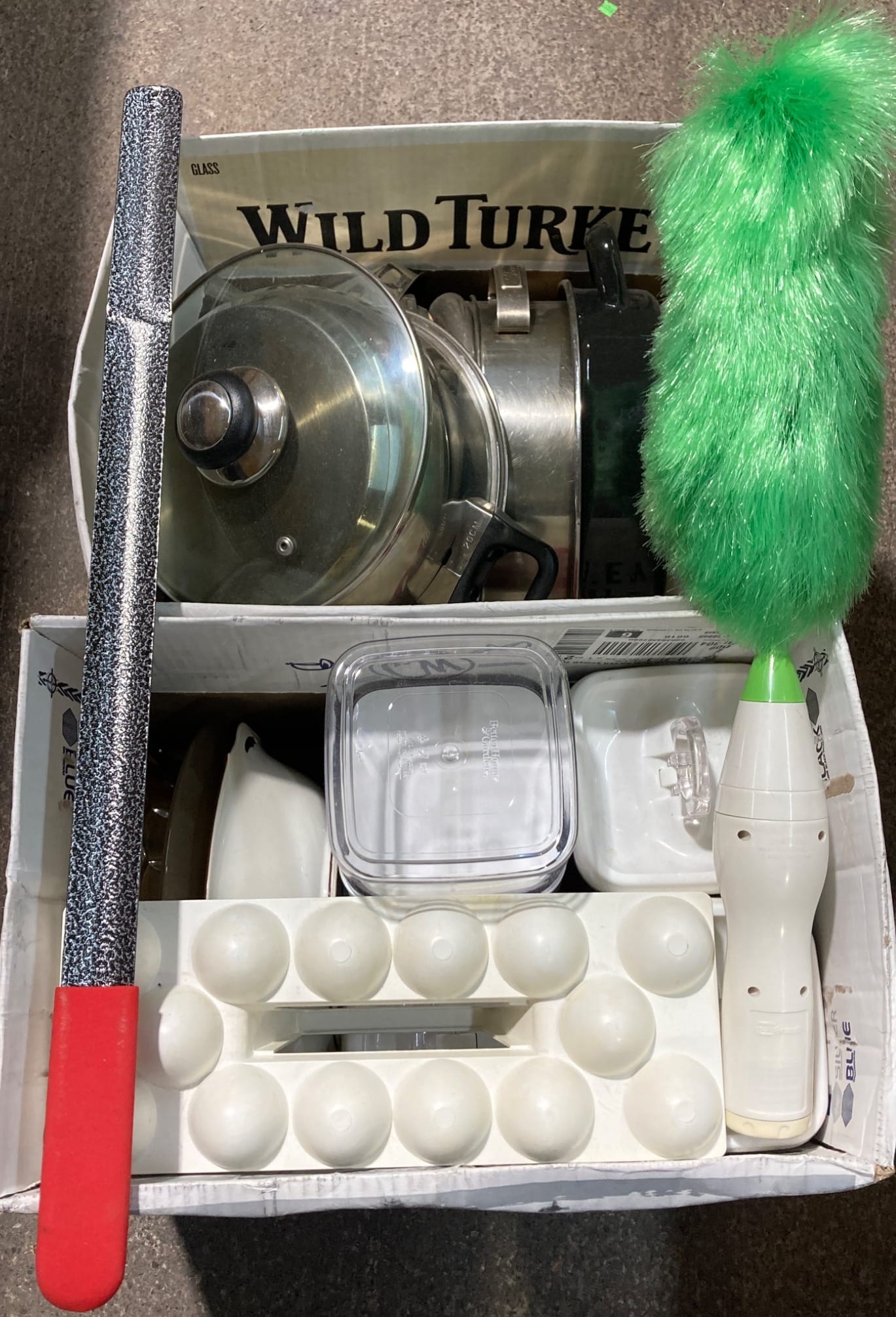 9038 3 Plastic Storage Totes with Mixed Household Items, Electrical Cords, Clock, Scrubber and Scales, Untested